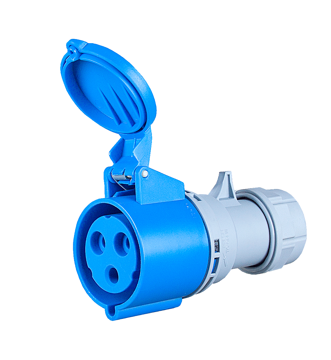 Кабельный силовой разъем СЕЕ 3-пин 32А с защитной крышкой, серия SHARK TT, <гнездо/мама>, структура: 3-х контактный, 32А/230V/2P+E/IP44, корпус - полиамид (PA6), контакты - латунь, безвинтовой зажим (безвинтовая клемма TURBO TWIST), класс защиты IP44, подходит для проводов сечением 2.5 - 6.0 мм2, кабельный ввод для кабеля диаметром (11.5-20.0 мм), цвет: синий