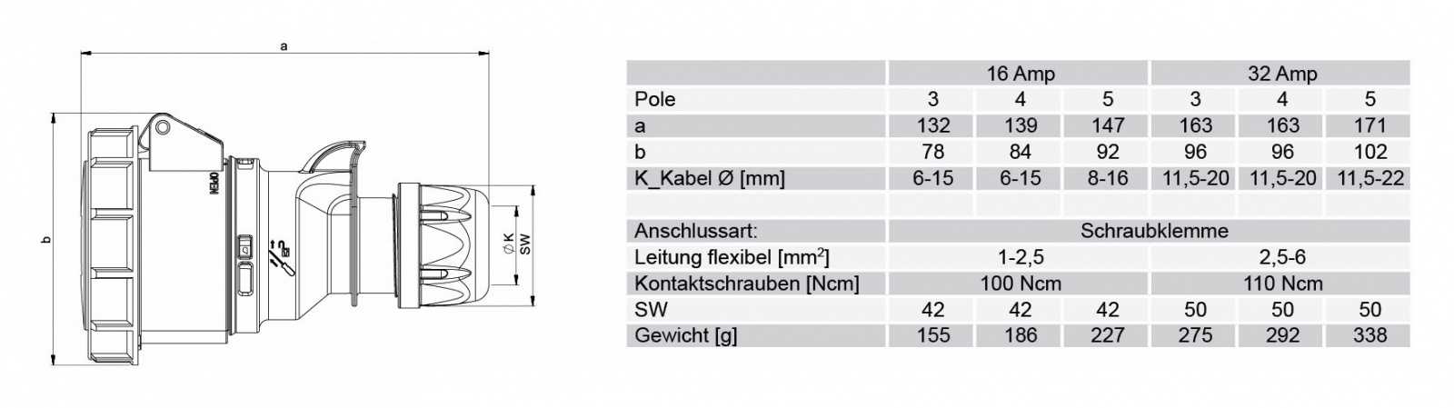 Категория Силовой Производитель PCE Категория товара Разъём Номинальный ток, А 32 Пол мама Установка кабельный Тип монтажа винтовая клемма Количество контактов 5 Диаметр совместимого кабеля, мм 11,5-20,0 Цвет корпуса красный Класс защиты IP67 Температура эксплуатации -30°C +80°C -