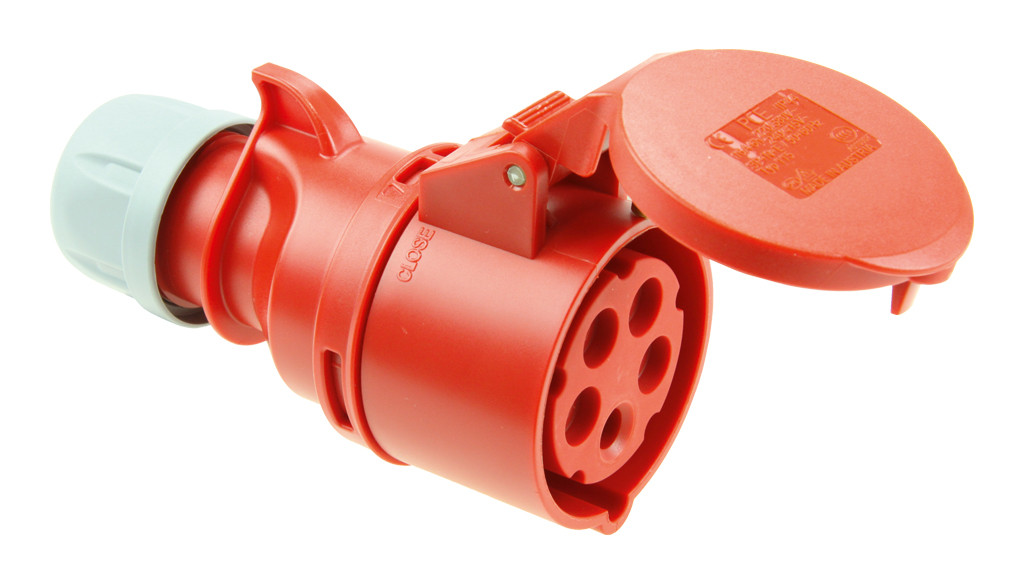 Кабельный силовой разъем СЕЕ 5-пин 32А с защитной крышкой, серия SHARK, <гнездо/мама>, структура: 5-и контактный, 32А/400V/3P+N+E/IP44, корпус - полиамид (PA6), контакты - латунь, под винтовой зажим (винтовая клемма TWIST), класс защиты IP44, подходит для проводов сечением 2.5 - 6.0 мм2, кабельный ввод для кабеля диаметром (11.5-20.0 мм), цвет: красный