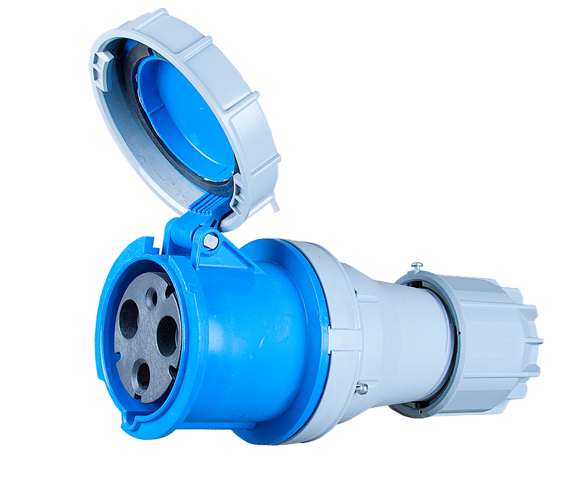 Кабельный силовой разъем СЕЕ 3-пин 125А с защитной крышкой, серия POWER TWIST, <гнездо/мама>, структура: 3-х контактный, 125А/230V/2P+E/IP67, корпус - полиамид (PA6), контакты - латунь, под винтовой зажим (винтовая клемма TWIST), класс защиты IP67, подходит для проводов сечением 16.0 - 50.0 мм2, кабельный ввод для кабеля диаметром (22.5-50.0 мм), цвет: синий