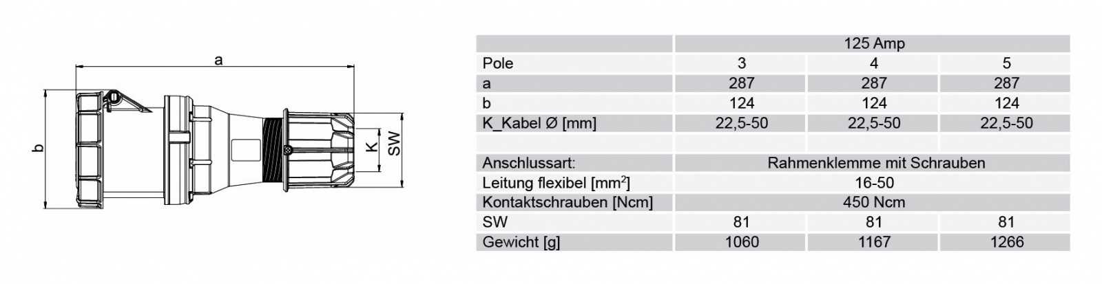 Категория Силовой Производитель PCE Категория товара Разъём Номинальный ток, А 125 Пол мама Установка кабельный Тип монтажа винтовая клемма Количество контактов 5 Диаметр совместимого кабеля, мм 22,5-50,0 Цвет корпуса черный Класс защиты IP67 Температура эксплуатации -30°C +80°C -