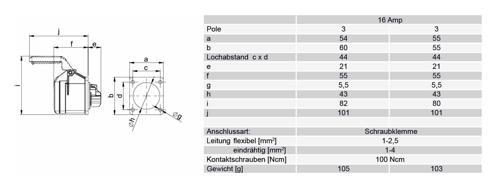 Панельный силовой разъем СЕЕ 3-пин 16А с защитной крышкой, серия SHARK, <гнездо/мама>, структура: 3-х контактный, 16А/230V/2P+E/IP44, корпус - полиамид (PA6), фланец 55x55 мм с 4 отв. 44x44 мм, диам. отв. 5.5 мм, контакты - латунь, под винтовой зажим (винтовая клемма TWIST), класс защиты IP44, подходит для проводов сечением: витая жила (1.0 - 2.5 мм2), цельная жила (1.0 - 4.0 мм2), цвет: синий