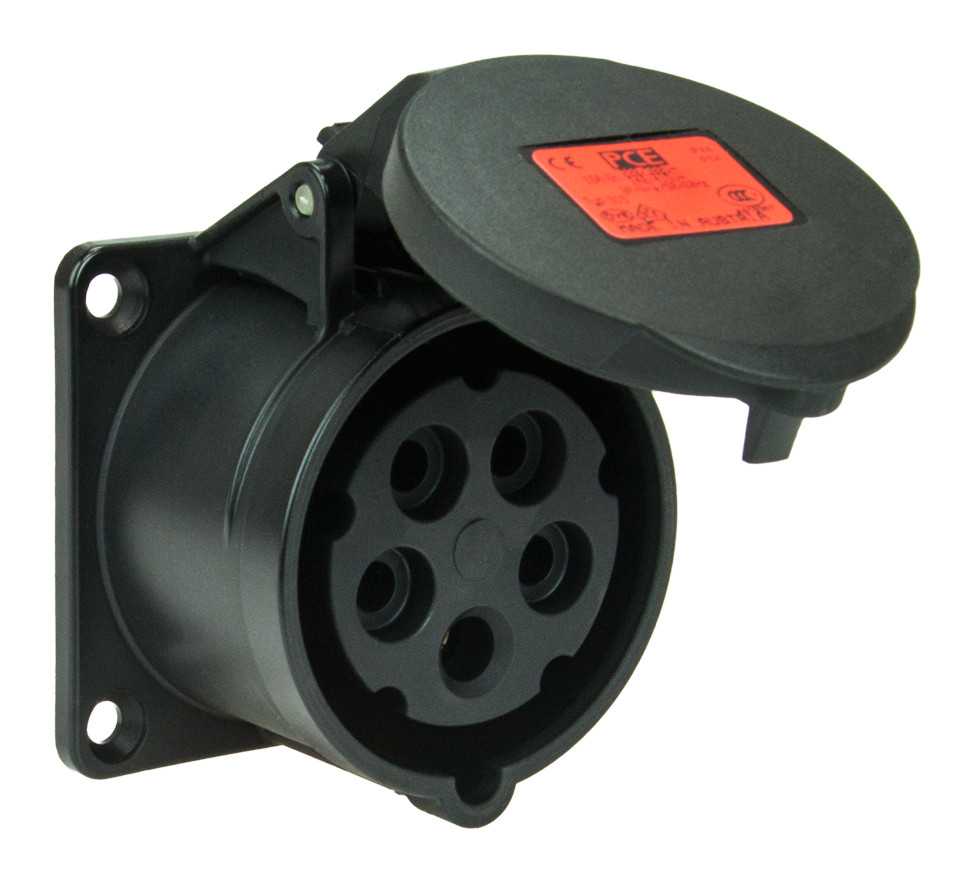 Панельный силовой разъем СЕЕ 4-пин 16А с защитной крышкой, серия MIDNIGHT SHARK TT, <гнездо/мама>, структура: 4-х контактный, 16А/400V/3P+E/IP44, корпус - полиамид (PA6), фланец 70x70 мм с 4 отв. 56x56 мм, диам. отв. 5.5 мм, контакты - латунь, безвинтовой зажим (безвинтовая клемма TURBO TWIST), класс защиты IP44, подходит для проводов сечением: витая жила (1.0 - 2.5 мм2), цельная жила (1.0 - 4.0 мм2), цвет: черный
