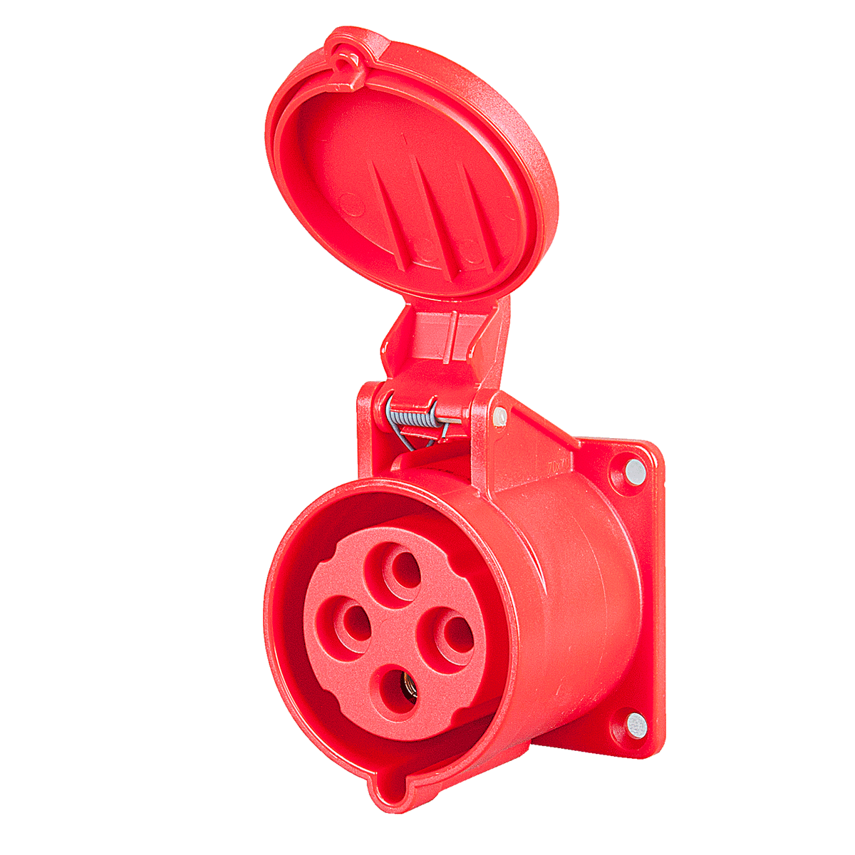 Панельный силовой разъем СЕЕ 4-пин 32А с защитной крышкой, серия SHARK, <гнездо/мама>, структура: 4-х контактный, 32А/400V/3P+E/IP44, корпус - полиамид (PA6), фланец 70x70 мм с 4 отв. 56x56 мм, диам. отв. 5.5 мм, контакты - латунь, под винтовой зажим (винтовая клемма TWIST), класс защиты IP44, подходит для проводов сечением: витая жила (2.5 - 6.0 мм2), цельная жила (2.5 - 10.0 мм2), цвет: красный