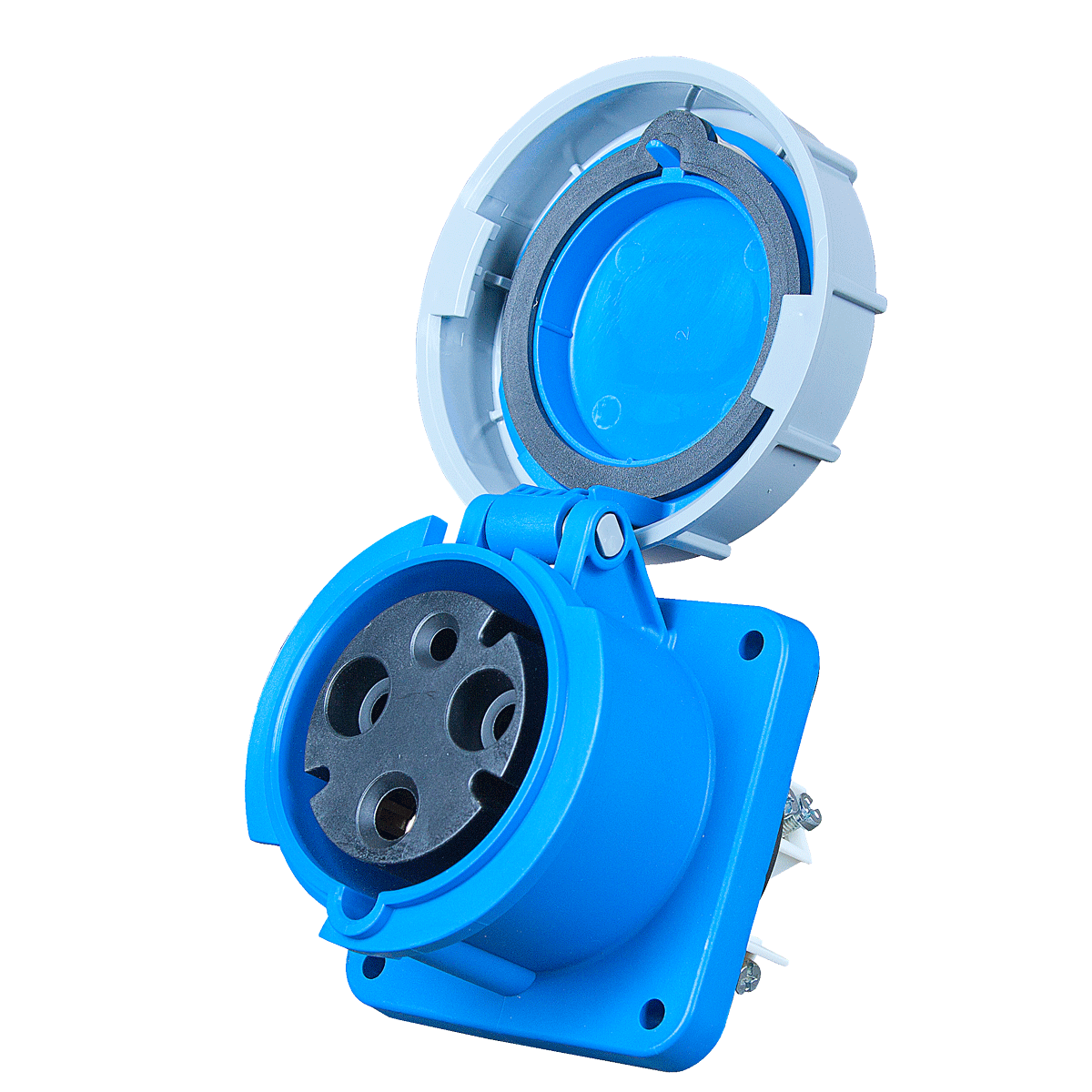 Панельный силовой разъем СЕЕ 3-пин 63А, серия POWER TWIST, <гнездо/мама>, структура: 3-х контактный, 63А/230V/2P+E/IP67, корпус - полиамид (PA6), фланец 100x100 мм с 4 отв. 80x80 мм, диам. отв. 7.0 мм, контакты - латунь, под винтовой зажим (винтовая клемма TWIST), класс защиты IP67, подходит для проводов сечением: витая жила (6.0 - 16.0 мм2), цельная жила (6.0 - 25.0 мм2), цвет: синий