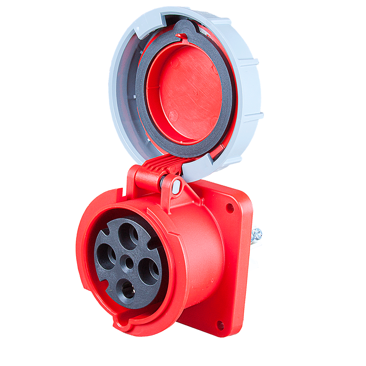 Панельный силовой разъем СЕЕ 4-пин 63А, серия POWER TWIST, <гнездо/мама>, структура: 4-х контактный, 63А/400V/3P+E/IP67, корпус - полиамид (PA6), фланец 100x100 мм с 4 отв. 80x80 мм, диам. отв. 7.0 мм, контакты - латунь, под винтовой зажим (винтовая клемма TWIST), класс защиты IP67, подходит для проводов сечением: витая жила (6.0 - 16.0 мм2), цельная жила (6.0 - 25.0 мм2), цвет: красный