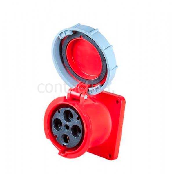 Панельный силовой разъем СЕЕ 4-пин 125А, серия POWER TWIST, <гнездо/мама>, структура: 4-х контактный, 125А/400V/3P+E/IP67, корпус - полиамид (PA6), фланец 120x120 мм с 4 отв. 100x100 мм, диам. отв. 8.0 мм, контакты - латунь, под винтовой зажим (винтовая клемма TWIST), класс защиты IP67, подходит для проводов сечением: витая жила (16.0 - 50.0 мм2), цельная жила (16.0 - 70.0 мм2), цвет: красный