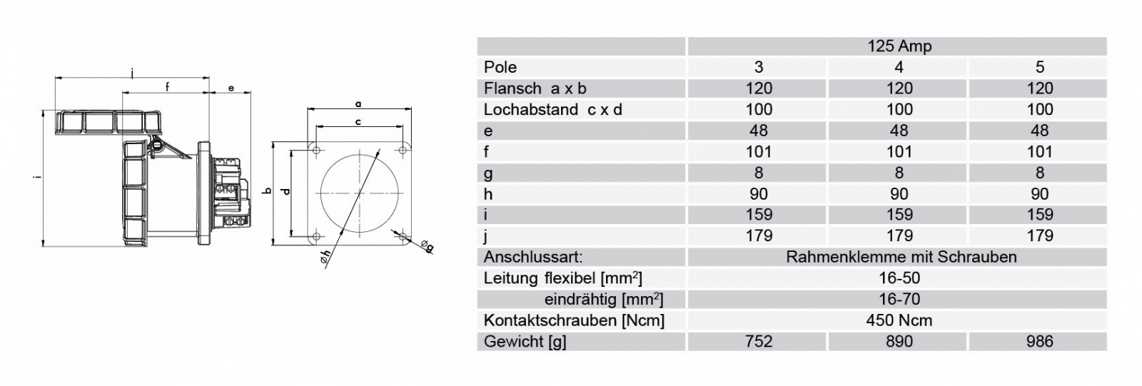 Категория Силовой Производитель PCE Категория товара Разъём Номинальный ток, А 125 Пол мама Установка панельный Тип монтажа винтовая клемма Количество контактов 5 Цвет корпуса черный Класс защиты IP67 Температура эксплуатации -30°C +80°C -