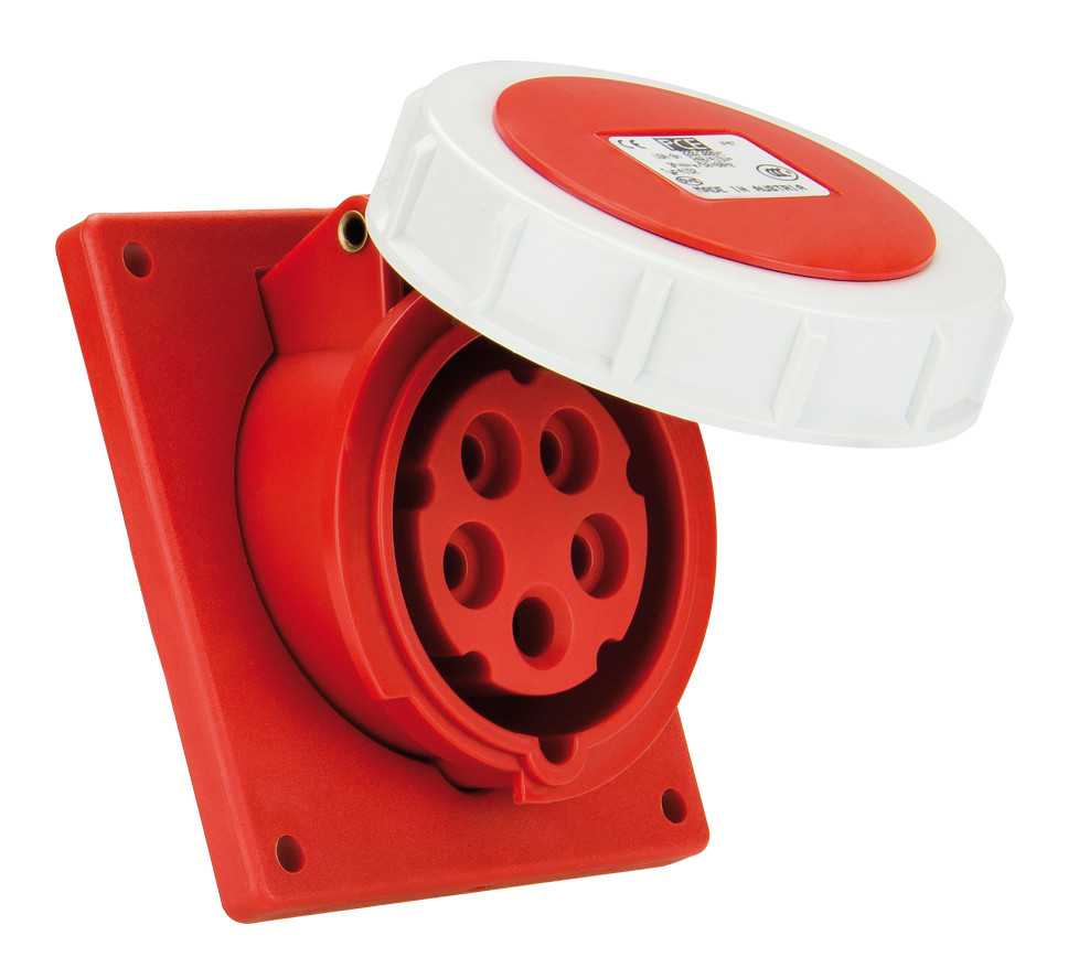 Панельный силовой разъем СЕЕ 5-пин 16А с защитной крышкой, наклонный, серия SHARK, <гнездо/мама>, структура: 5-и контактный, 16А/400V/3P+N+E/IP67, корпус - полиамид (PA6), фланец 92x100 мм с 4 отв. 77x85 мм, диам. отв. 5.5 мм, контакты - латунь, под винтовой зажим (винтовая клемма TWIST), класс защиты IP67, подходит для проводов сечением: витая жила (1.0 - 2.5 мм2), цельная жила (1.0 - 4.0 мм2), цвет: красный