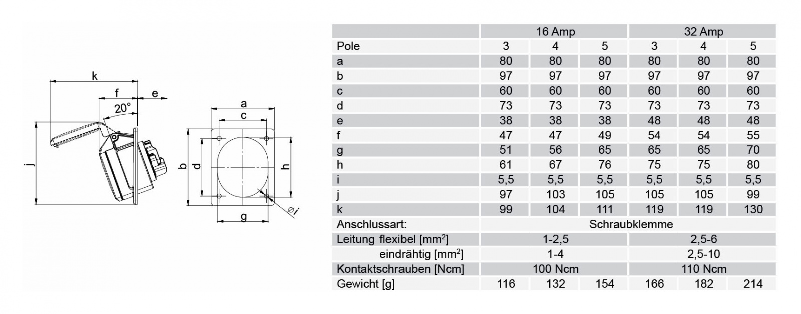 Панельный силовой разъем СЕЕ 5-пин 16А с защитной крышкой, наклонный, серия SHARK, <гнездо/мама>, структура: 5-и контактный, 16А/400V/3P+N+E/IP44, корпус - полиамид (PA6), фланец 80x97 мм с 4 отв. 60x73 мм, диам. отв. 5.5 мм, контакты - латунь, под винтовой зажим (винтовая клемма TWIST), класс защиты IP44, подходит для проводов сечением: витая жила (1.0 - 2.5 мм2), цельная жила (1.0 - 4.0 мм2), цвет: красный