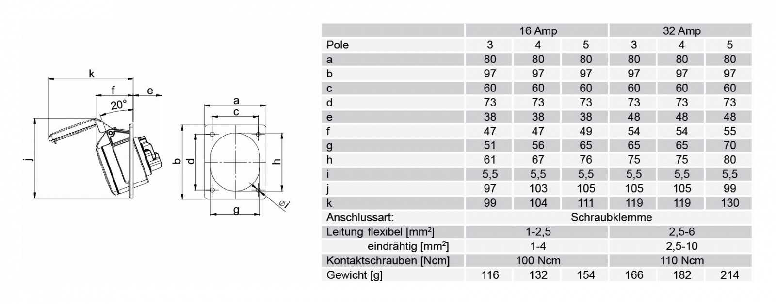 Панельный силовой разъем СЕЕ 3-пин 32А с защитной крышкой, наклонный, серия MIDNIGHT SHARK TT, <гнездо/мама>, структура: 3-х контактный, 32А/230V/2P+E/IP44, корпус - полиамид (PA6), фланец 80x97 мм с 4 отв. 60x73 мм, диам. отв. 5.5 мм, контакты - латунь, безвинтовой зажим (безвинтовая клемма TURBO TWIST), класс защиты IP44, подходит для проводов сечением: витая жила (2.5 - 6.0 мм2), цельная жила (2.5 - 10.0 мм2), цвет: черный
