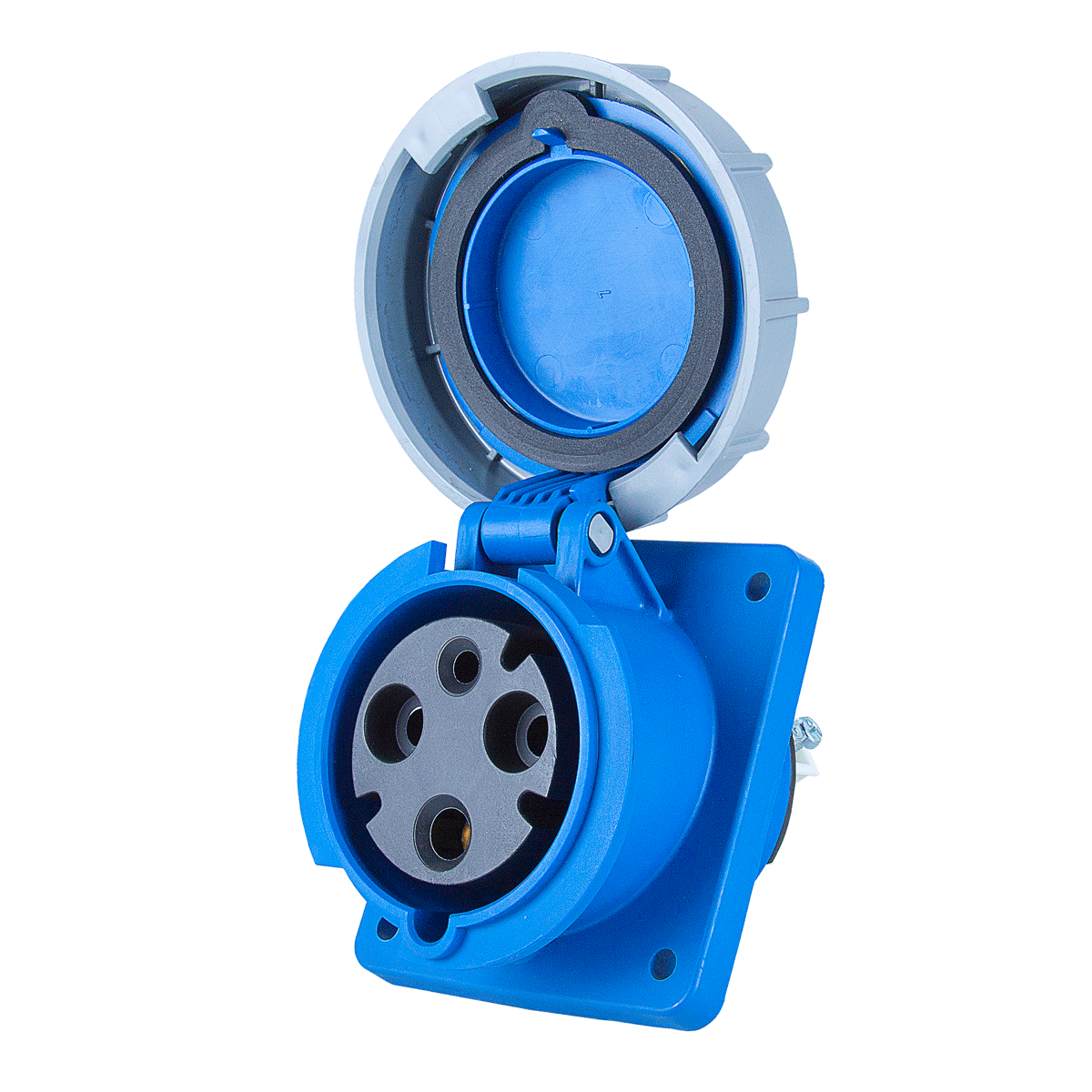 Панельный силовой разъем СЕЕ 3-пин 63А с защитной крышкой, наклонный, серия POWER TWIST, <гнездо/мама>, структура: 3-х контактный, 63А/230V/2P+E/IP67, корпус - полиамид (PA6), фланец 100x112 мм с 4 отв. 80x88 мм, диам. отв. 7.0 мм, контакты - латунь, под винтовой зажим (винтовая клемма TWIST), класс защиты IP67, подходит для проводов сечением: витая жила (6.0 - 16.0 мм2), цельная жила (6.0 - 25.0 мм2), цвет: синий