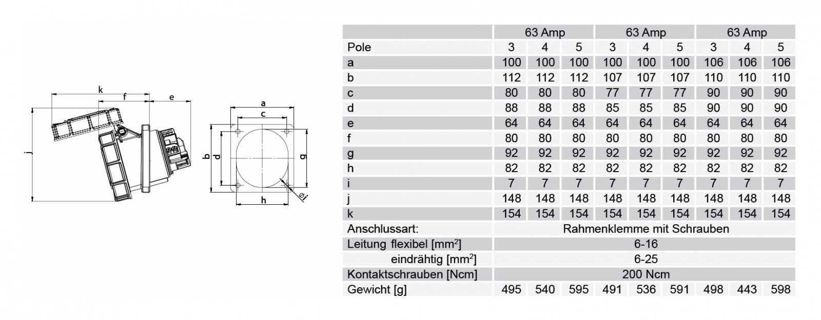 Панельный силовой разъем СЕЕ 5-пин 63А с защитной крышкой, наклонный, серия POWER TWIST, <гнездо/мама>, структура: 5-и контактный, 63А/400V/3P+N+E/IP67, корпус - полиамид (PA6), фланец 100x112 мм с 4 отв. 80x88 мм, диам. отв. 7.0 мм, контакты - латунь, под винтовой зажим (винтовая клемма TWIST), класс защиты IP67, подходит для проводов сечением: витая жила (6.0 - 16.0 мм2), цельная жила (6.0 - 25.0 мм2), цвет: красный