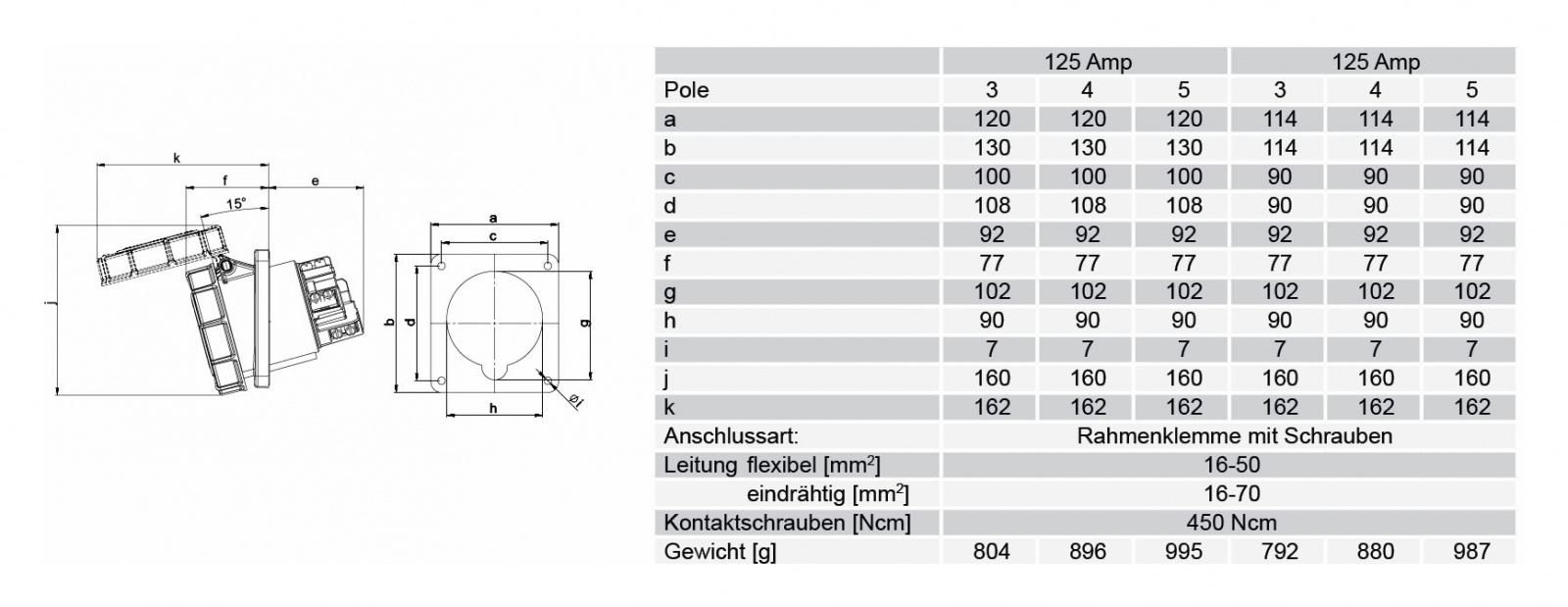 Панельный силовой разъем СЕЕ 3-пин 125А с защитной крышкой, наклонный, серия MIDNIGHT POWER TWIST, <гнездо/мама>, структура: 3-х контактный, 125А/230V/2P+E/IP67, корпус - полиамид (PA6), фланец 120x130 мм с 4 отв. 100x108 мм, диам. отв. 7.0 мм, контакты - латунь, под винтовой зажим (винтовая клемма TWIST), класс защиты IP67, подходит для проводов сечением: витая жила (16.0 - 50.0 мм2), цельная жила (16.0 - 70.0 мм2), цвет: черный