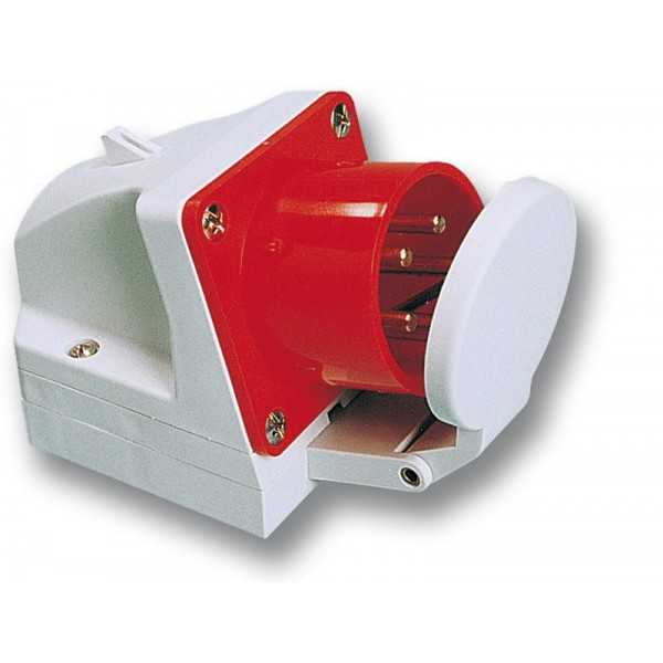 Панельный силовой разъем СЕЕ 4-пин 16А, настенный, защитная крышка, серия SHARK, <штекер/папа>, структура: 4-х контактный, 16А/400V/3P+E/IP44, корпус - полиамид (PA6), крепление на поверхность / наклон 15°, контакты - латунь, под винтовой зажим (винтовая клемма TWIST), класс защиты IP44, подходит для проводов сечением: витая жила (1.0 - 2.5 мм2), цельная жила (1.0 - 4.0 мм2), цвет: красный
