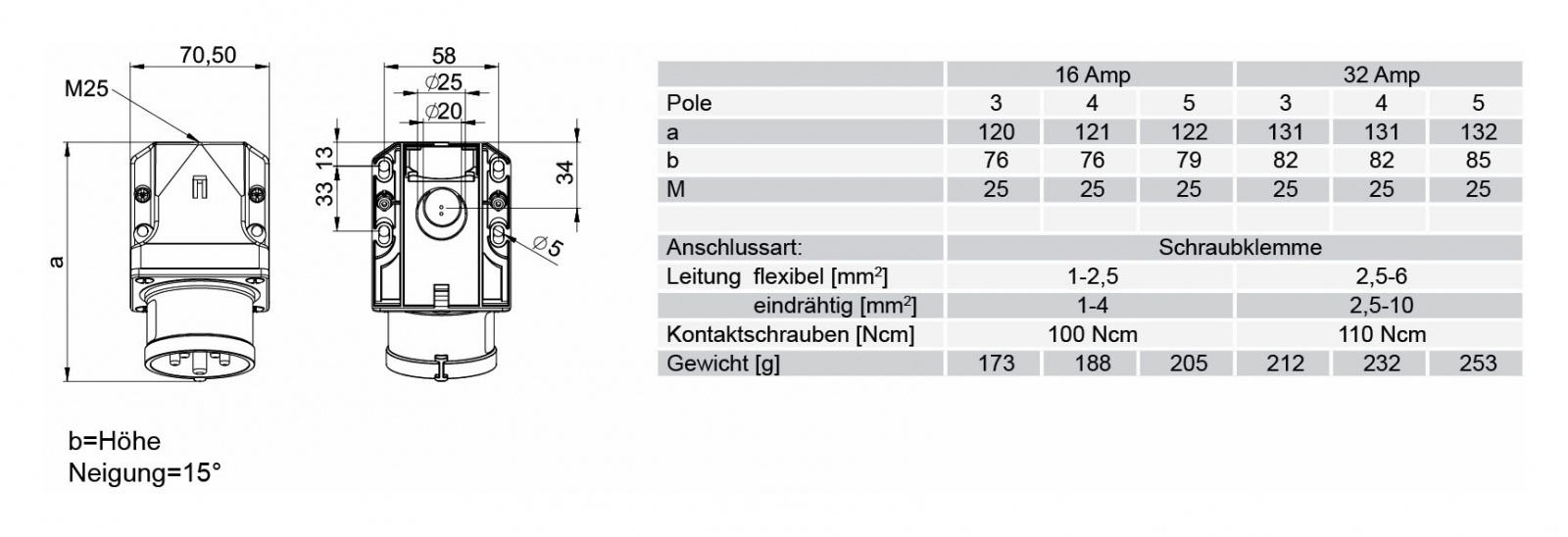 Панельный силовой разъем СЕЕ 4-пин 32А, настенный, серия SHARK, <штекер/папа>, структура: 4-х контактный, 32А/400V/3P+E/IP44, корпус - полиамид (PA6), крепление на поверхность / наклон 15°, контакты - латунь, под винтовой зажим (винтовая клемма TWIST), класс защиты IP44, подходит для проводов сечением: витая жила (2.5 - 6.0 мм2), цельная жила (2.5 - 10.0 мм2), цвет: красный