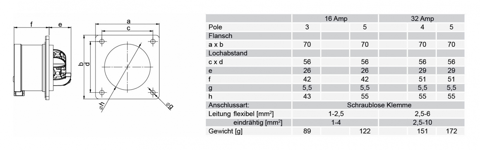 Панельный силовой разъем СЕЕ 5-пин 32А, серия MIDNIGHT SHARK TT, <штекер/папа>, структура: 5-и контактный, 32А/400V/3P+N+E/IP44, корпус - полиамид (PA6), фланец 70x70 мм с 4 отв. 56x56 мм, диам. отв. 5.5 мм, контакты - латунь, безвинтовой зажим (безвинтовая клемма TURBO TWIST), класс защиты IP44, подходит для проводов сечением: витая жила (2.5 - 6.0 мм2), цельная жила (2.5 - 10.0 мм2), цвет: черный