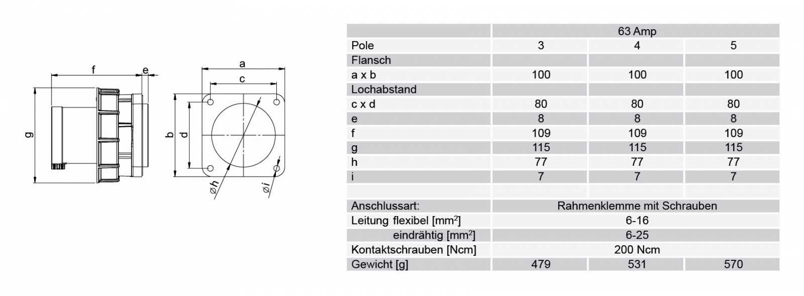 Панельный силовой разъем СЕЕ 4-пин 63А, серия POWER TWIST, <штекер/папа>, структура: 4-х контактный, 63А/400V/3P+E/IP67, корпус - полиамид (PA6), фланец 100x100 мм с 4 отв. 80x80 мм, диам. отв. 7.0 мм, контакты - латунь, под винтовой зажим (винтовая клемма TWIST), класс защиты IP67, подходит для проводов сечением: витая жила (6.0 - 16.0 мм2), цельная жила (6.0 - 25.0 мм2), цвет: красный