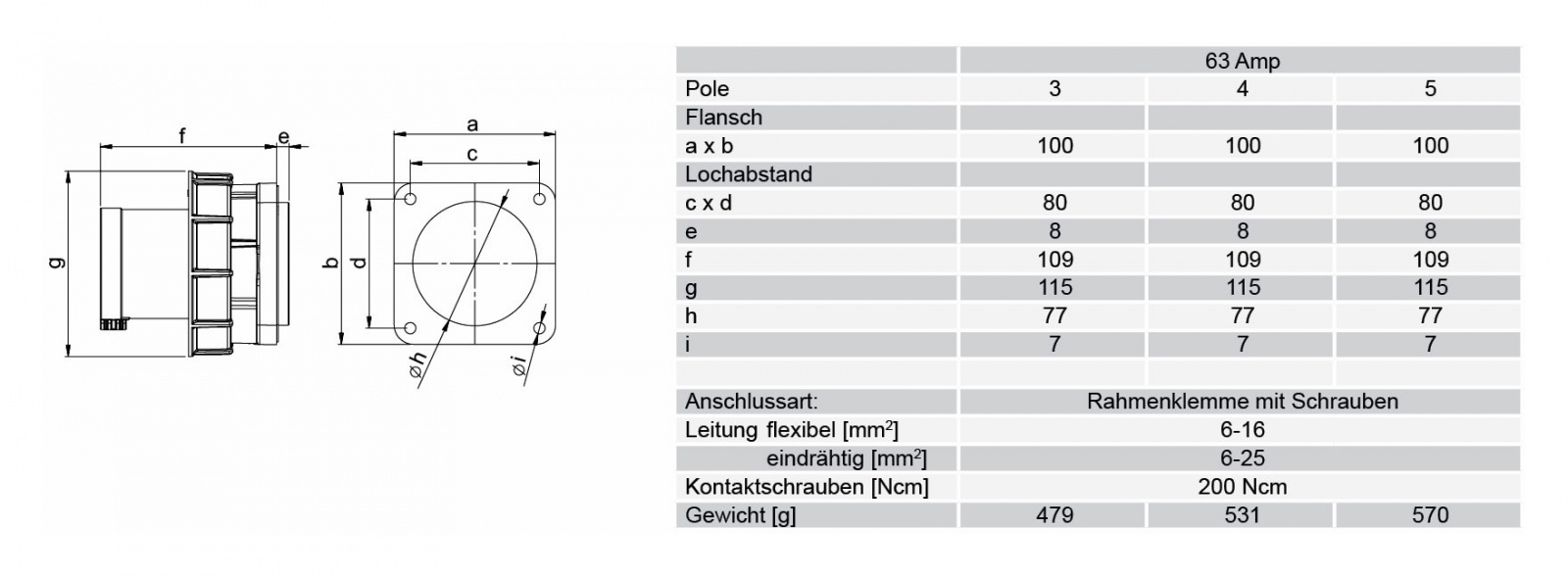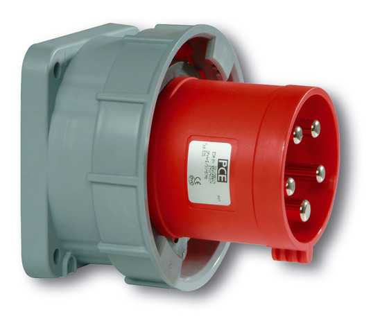 Панельный силовой разъем СЕЕ 5-пин 63А, серия POWER TWIST, <штекер/папа>, структура: 5-и контактный, 63А/400V/3P+N+E/IP67, корпус - полиамид (PA6), фланец 100x100 мм с 4 отв. 80x80 мм, диам. отв. 7.0 мм, контакты - латунь, под винтовой зажим (винтовая клемма TWIST), класс защиты IP67, подходит для проводов сечением: витая жила (6.0 - 16.0 мм2), цельная жила (6.0 - 25.0 мм2), цвет: красный