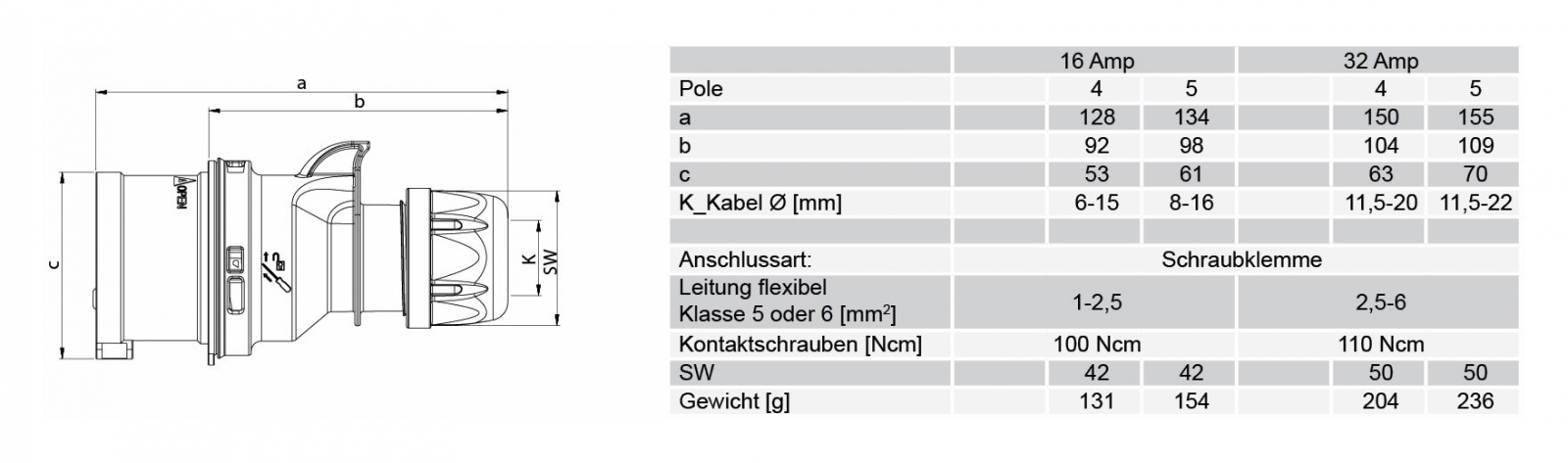Категория Силовой Производитель PCE Категория товара Разъём Номинальный ток, А 16 Пол папа Установка кабельный Тип монтажа винтовая клемма Количество контактов 5 Диаметр совместимого кабеля, мм 8,0-16,0 Цвет корпуса красный Класс защиты IP44 Температура эксплуатации -30°C +80°C -