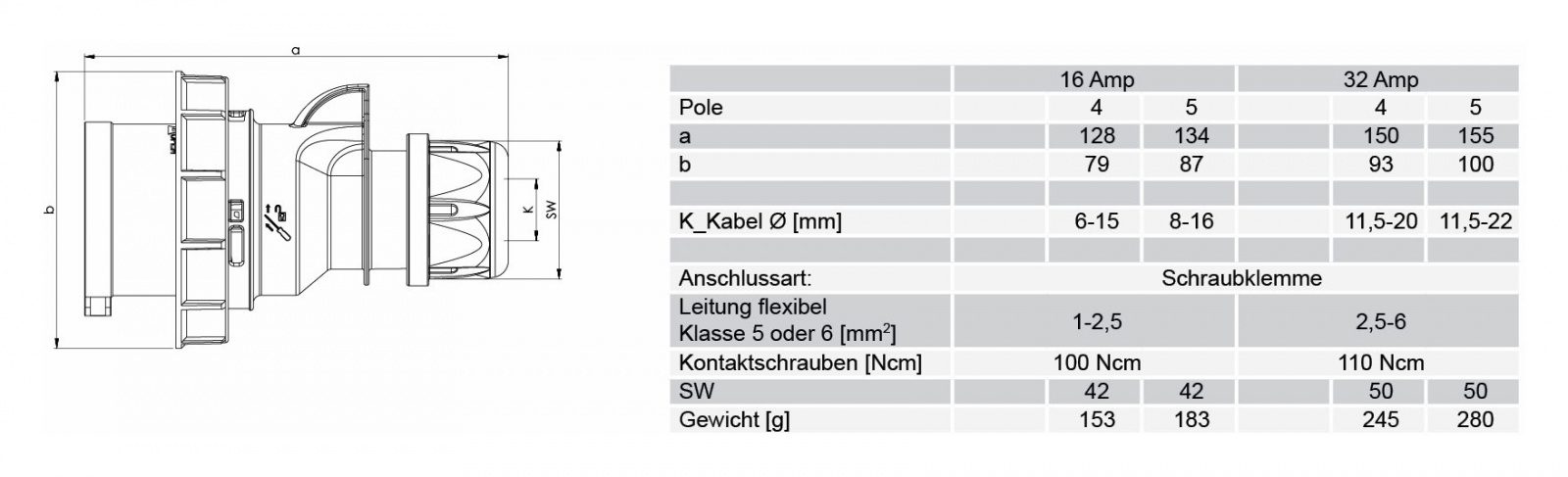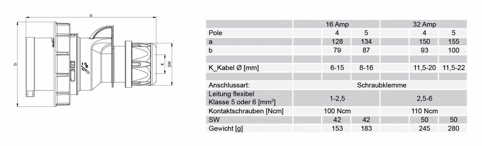 Категория Силовой Производитель PCE Категория товара Разъём Номинальный ток, А 32 Пол папа Установка кабельный Тип монтажа винтовая клемма Количество контактов 4 Диаметр совместимого кабеля, мм 11,5-20,0 Цвет корпуса красный Класс защиты IP67 Температура эксплуатации -30°C +80°C -