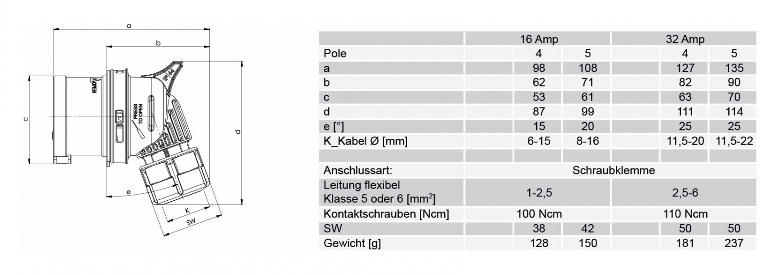 Категория Силовой Производитель PCE Категория товара Разъём Номинальный ток, А 32 Пол папа Установка кабельный, угловой Тип монтажа винтовая клемма Количество контактов 5 Диаметр совместимого кабеля, мм 11,5-20,0 Цвет корпуса красный Класс защиты IP44 Температура эксплуатации -30°C +80°C -