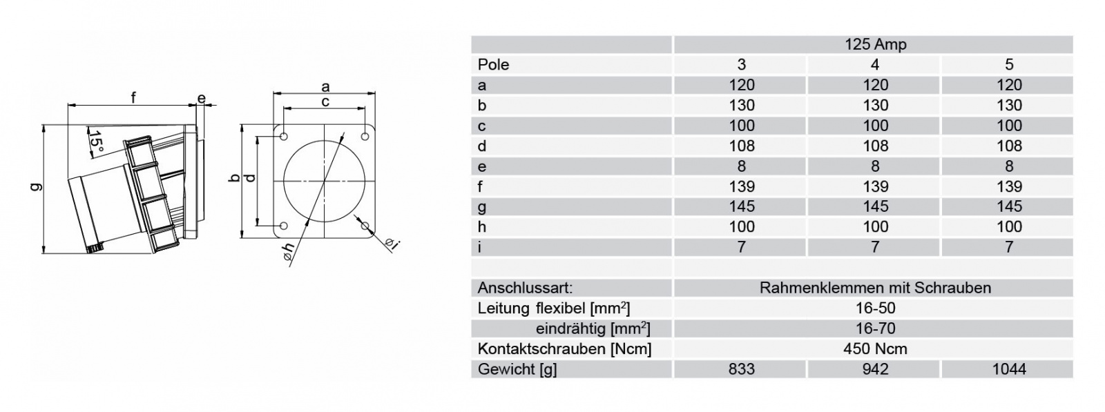 Панельный силовой разъем СЕЕ 5-пин 125А, наклонный, серия POWER TWIST, <штекер/папа>, структура: 5-и контактный, 125А/400V/3P+N+E/IP67, корпус - полиамид (PA6), фланец 120x130 мм с 4 отв. 100x108 мм, диам. отв. 7.0 мм, контакты - латунь, под винтовой зажим (винтовая клемма TWIST), класс защиты IP67, подходит для проводов сечением: витая жила (16.0 - 50.0 мм2), цельная жила (16.0 - 70.0 мм2), цвет: красный