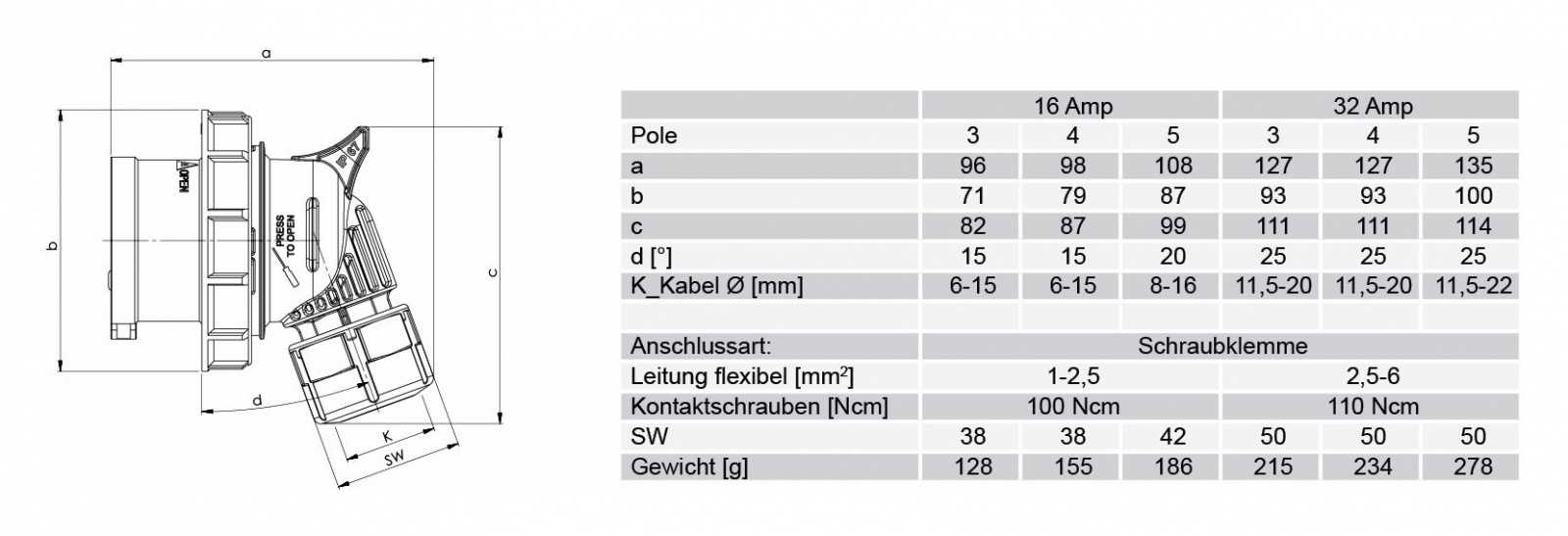 Категория Силовой Категория товара Разъём Производитель PCE Номинальный ток, А 32 Пол папа Установка кабельный, угловой Тип монтажа винтовая клемма Количество контактов 5 Диаметр совместимого кабеля, мм 11,5-20,0 Цвет корпуса красный Класс защиты IP67 Температура эксплуатации -30°C +80°C -