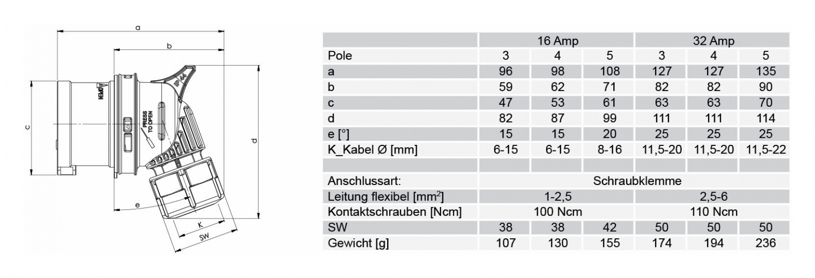 Категория Силовой Производитель PCE Категория товара Разъём Номинальный ток, А 32 Пол папа Установка кабельный, угловой Тип монтажа винтовая клемма Количество контактов 5 Диаметр совместимого кабеля, мм 11,5-20,0 Цвет корпуса красный Класс защиты IP44 Температура эксплуатации -30°C +80°C -