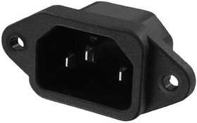 Панельный разъем C14 IEC 60320, 3-х контактный <штекер/папа>, корпус: полибутилентерефталат PBT, плоские вертикальные контакты - фосфористая бронза /покрытие никель, ножевые клеммы под пайку, структура: 2P+E (10 А /250 В), для проводов сечением до 0.75-1.5 мм2 (AWG18-14), класс защиты IP20; цвет: черный