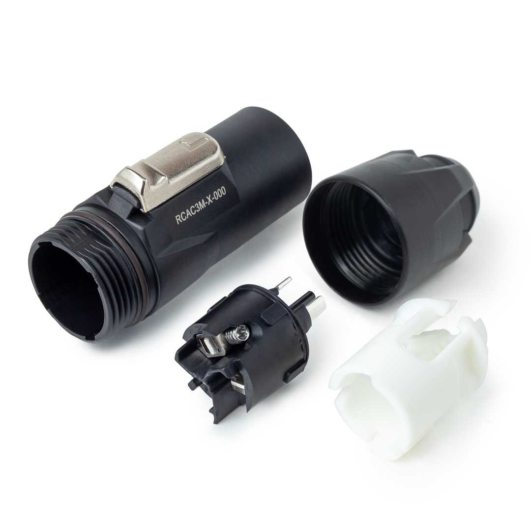 Кабельный разъем powerCON TRUE1, 16 А, power IN (для входа питания), пыле- и влагозащищенный, класс защиты (IP65), 3-х контактный, штекер/папа, корпус - полиамид (PA), надежная система блокировки соединения, контакты - покрытие серебро, под винтовой зажим (винтовые клеммы), подходит для проводов сечением до 2.5 мм2 (AWG 12), номинальное напряжением 250 В (переменное) / номинальный ток 16 А при сечении 2.5 мм2, на кабель диаметром (6.0-12.0 мм). Данный разъем совместим с панельным разъемом POWER OUT (для выхода питания) Rean RAC3F-X-000, MRC RPWSX-F, Neutrik NAC3FPX. ВНИМАНИЕ: возможно безопасное подключение под нагрузкой!