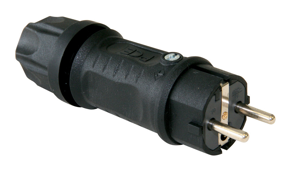 Кабельный усиленный разъем SCHUKO, <штекер/папа>, двойное заземление, серия MIDNIGHT TOP TAURUS, структура: 3-х контактный, 16А/250V/2P+E/IP44, корпус - твёрдая резина, вставка конт. группы- твёрдая резина, каб. ввод - полиамид, контакты - покрытие никель, под винтовой зажим (винтовая клемма), класс защиты IP44, для кабеля диаметром (6.0-13.0 мм)