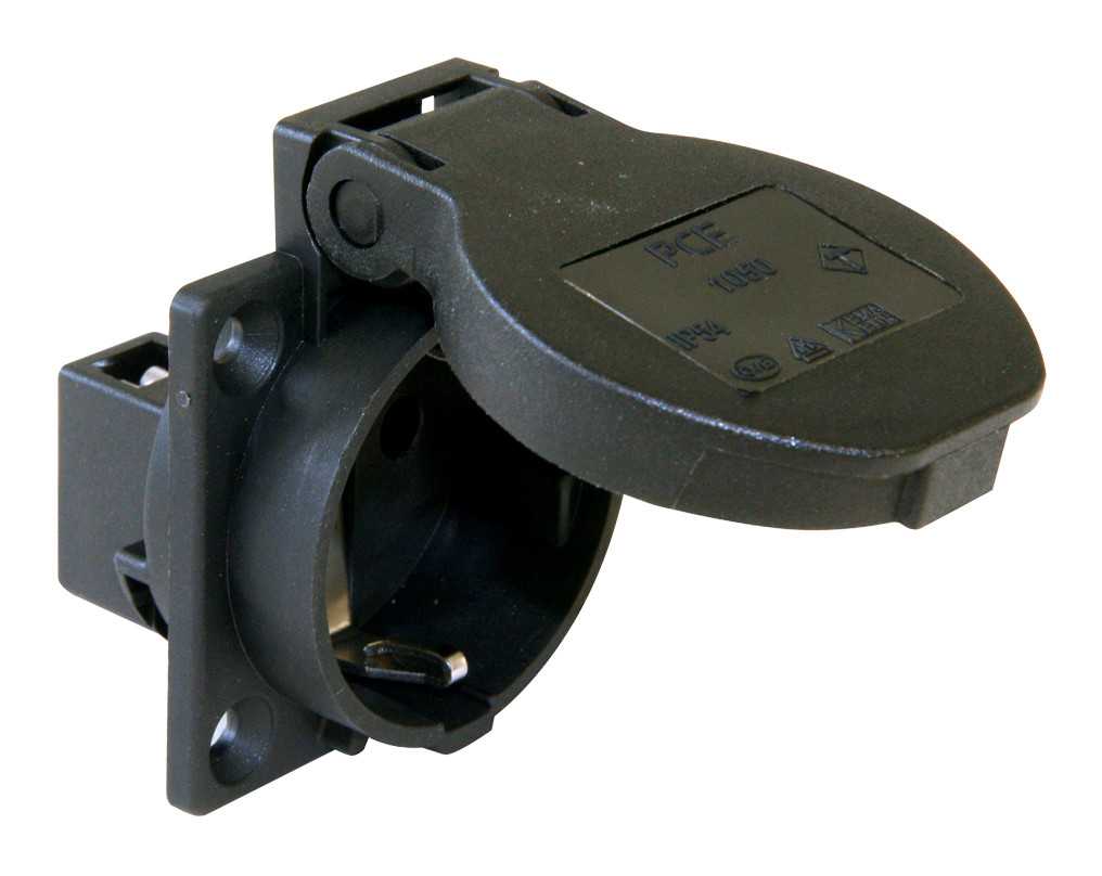 Панельный разъем SCHUKO, <гнездо/мама>, боковое подключение, защитная крышка, серия MIDNIGHT P-NOVA Plus, структура: 3-х контактный, 16A/250V/2P+E/IP54, корпус - полиамид (PA), фланец 50x50 мм с 4 отв. 38x38 мм, контакты - покрытие никель, под винтовой зажим (винтовая клемма), класс защиты IP54, для кабеля сечением (1.5-2.5 мм2)