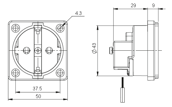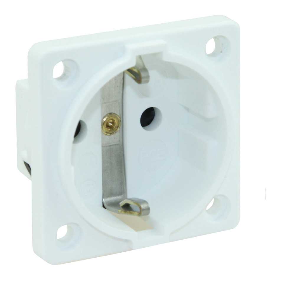 Панельный разъем SCHUKO, <гнездо/мама>, защитные шторки, боковое подключение, серия P-NOVA Plus, структура: 3-х контактный, 16A/250V/2P+E/IP20, корпус - полиамид (PA), фланец 50x50 мм с 4 отв. 38x38 мм, контакты - покрытие никель, под винтовой зажим (винтовая клемма), класс защиты IP20, для кабеля сечением (1.5-2.5 мм2)