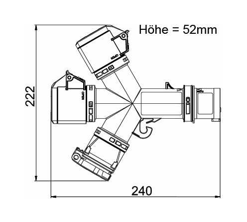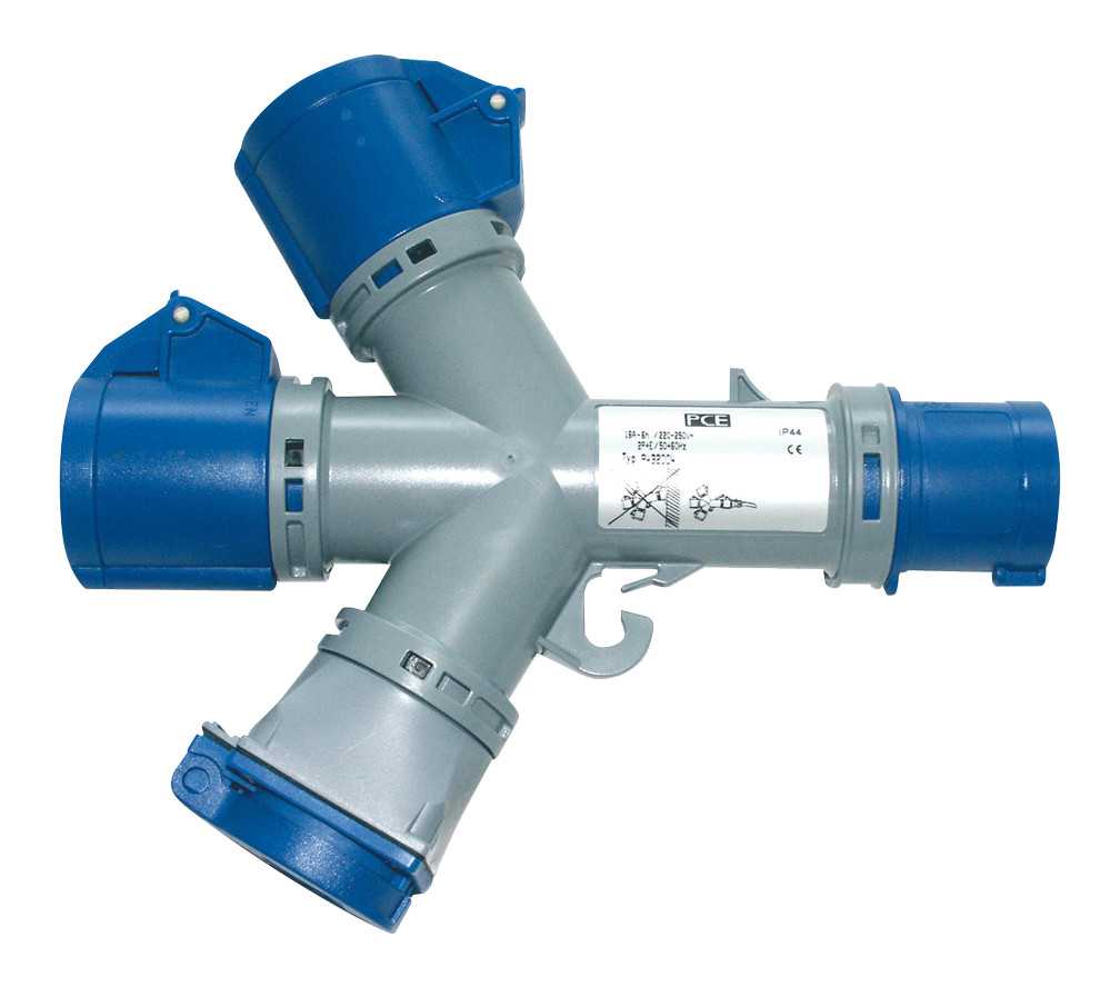 Тройник «1х СЕЕ 3-пин 16А штекер > 2х СЕЕ 3-пин 16А гнездо > 1x SCHUKO 16А гнездо», структура: 3-х контактный, 16А/230V/2P+E/IP44, корпус - полиамид (PA), контакты - покрытие никель, класс защиты IP44