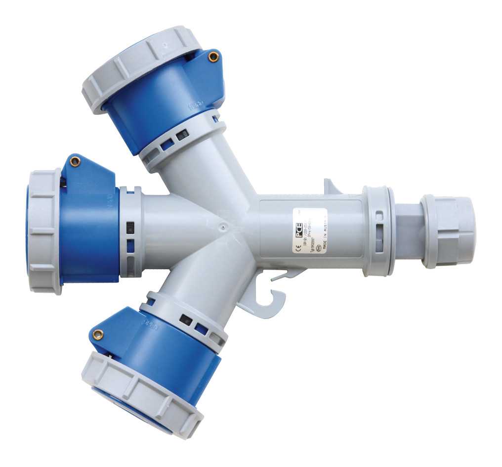 Тройник «каб. ввод > 3х СЕЕ 3-пин 16А гнездо», структура: 3-х контактный, 16А/230V/2P+E/IP44, корпус - полиамид (PA), контакты - покрытие никель, класс защиты IP44