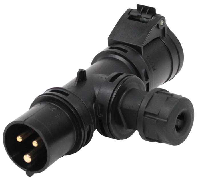 Разветвитель «1х СЕЕ 3-пин 16А штекер > 1х СЕЕ 3-пин 16А гнездо > каб. ввод», структура: 3-х контактный, 16А/230V/2P+E/IP44, корпус - полиамид (PA), контакты - покрытие никель, класс защиты IP44, на кабель (диам. 12.00 мм / сечением 3x2.5мм2)