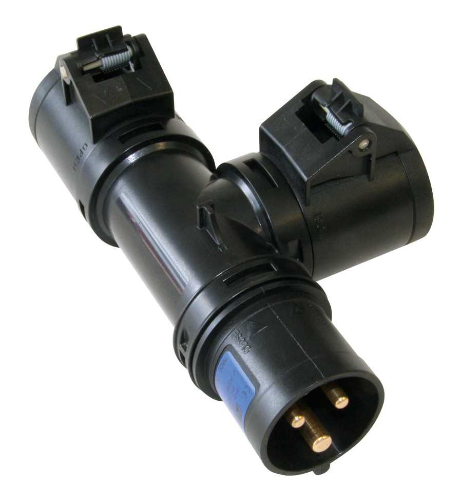 Разветвитель «1х СЕЕ 3-пин 16А штекер > 2х СЕЕ 3-пин 16А гнездо», структура: 3-х контактный, 16А/230V/2P+E/IP44, корпус - полиамид (PA), контакты - покрытие никель, класс защиты IP44
