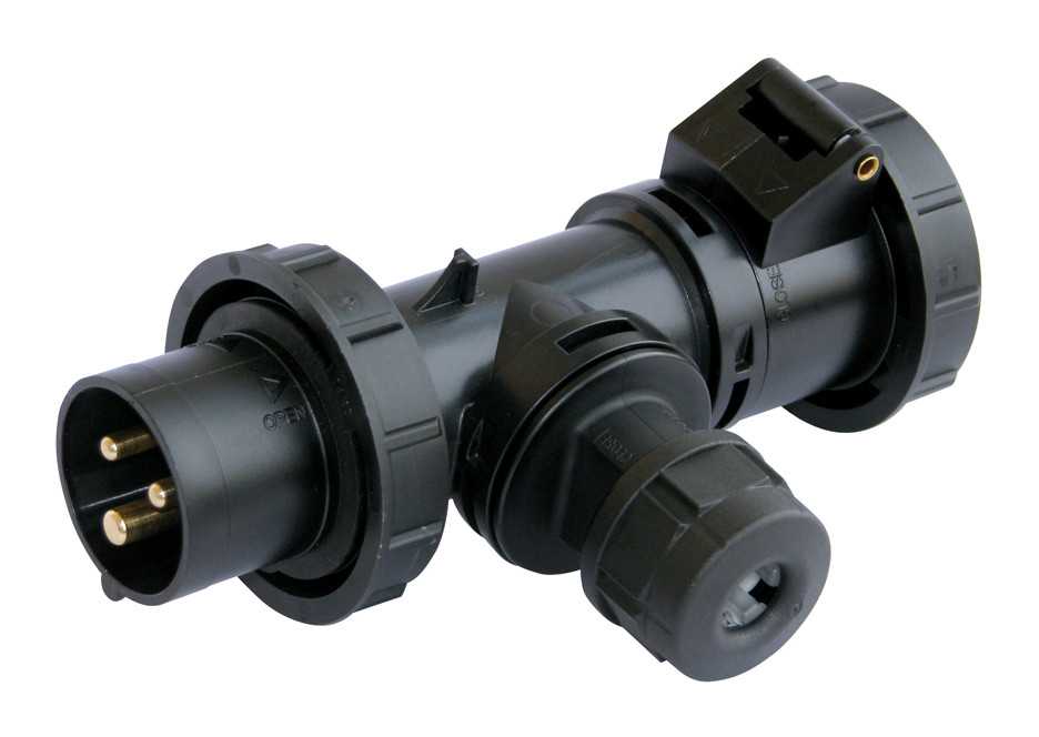 Разветвитель «1х СЕЕ 3-пин 16А штекер > 1х СЕЕ 3-пин 16А гнездо > каб. ввод», накидная гайка, структура: 3-х контактный, 16А/230V/2P+E/IP67, корпус - полиамид (PA), контакты - покрытие никель, класс защиты IP67, на кабель (диам. 12.00 мм / сечением 3x2.5мм2)