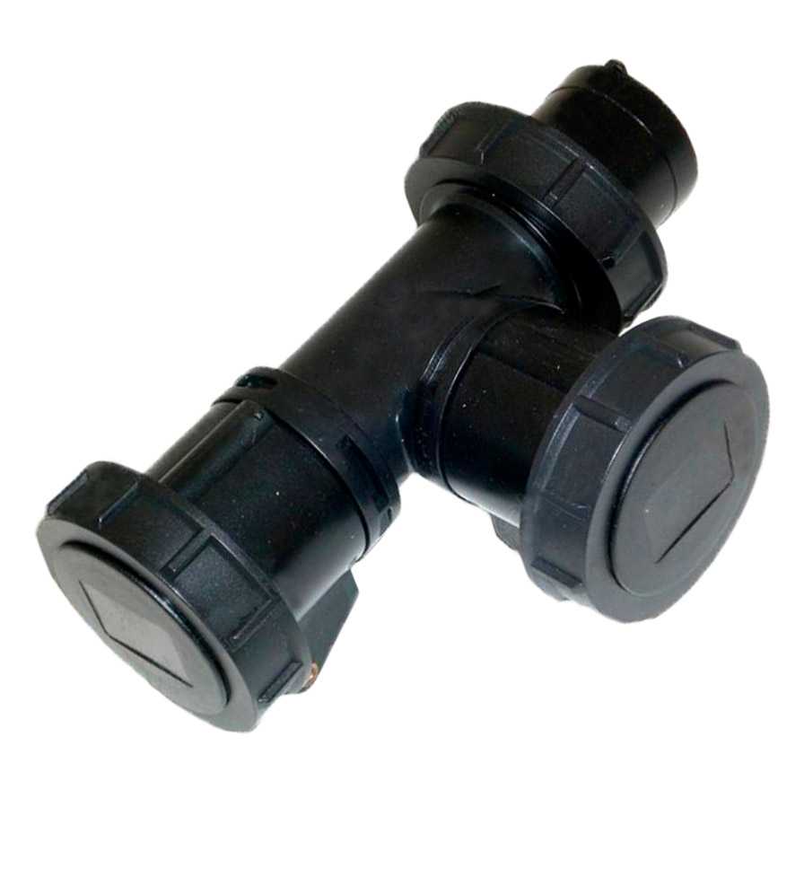 Разветвитель «1х СЕЕ 3-пин 16А штекер > 2х СЕЕ 3-пин 16А гнездо», накидная гайка, структура: 3-х контактный, 16А/230V/2P+E/IP67, корпус - полиамид (PA), контакты - покрытие никель, класс защиты IP67