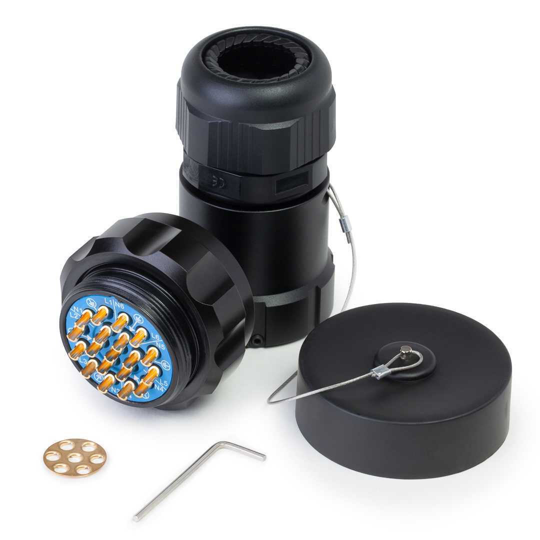 Кабельный разъем Socapex, <штекер/папа>, для 6 световых приборов, структура: 19-и контактный, 600В/ 2КВ, корпус - алюминиевый, контакты - латунь /покрытие золото, под пайку, класс защиты IP67, подходит для проводов сечением 1.5 - 2.5 мм2, кабельный ввод для кабеля диаметром (15.0-32.0 мм), цвет: черный