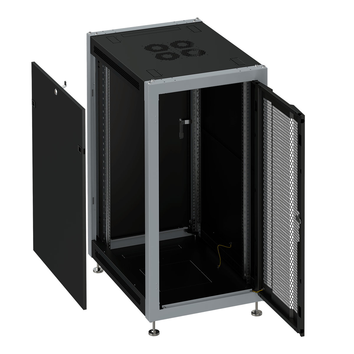 Съемные боковые панели на замках, гарантируют контроль доступа к телеком оборудованию.