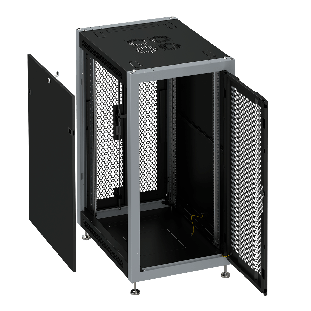 Съемные боковые панели оснащенные замками, обеспечивают контроль доступа к установленному оборудованию. Сверху и снизу, по четыре кабельных ввода. За счет перфорации в нижней и верхней части корпуса, улучшена пассивная вентиляция.