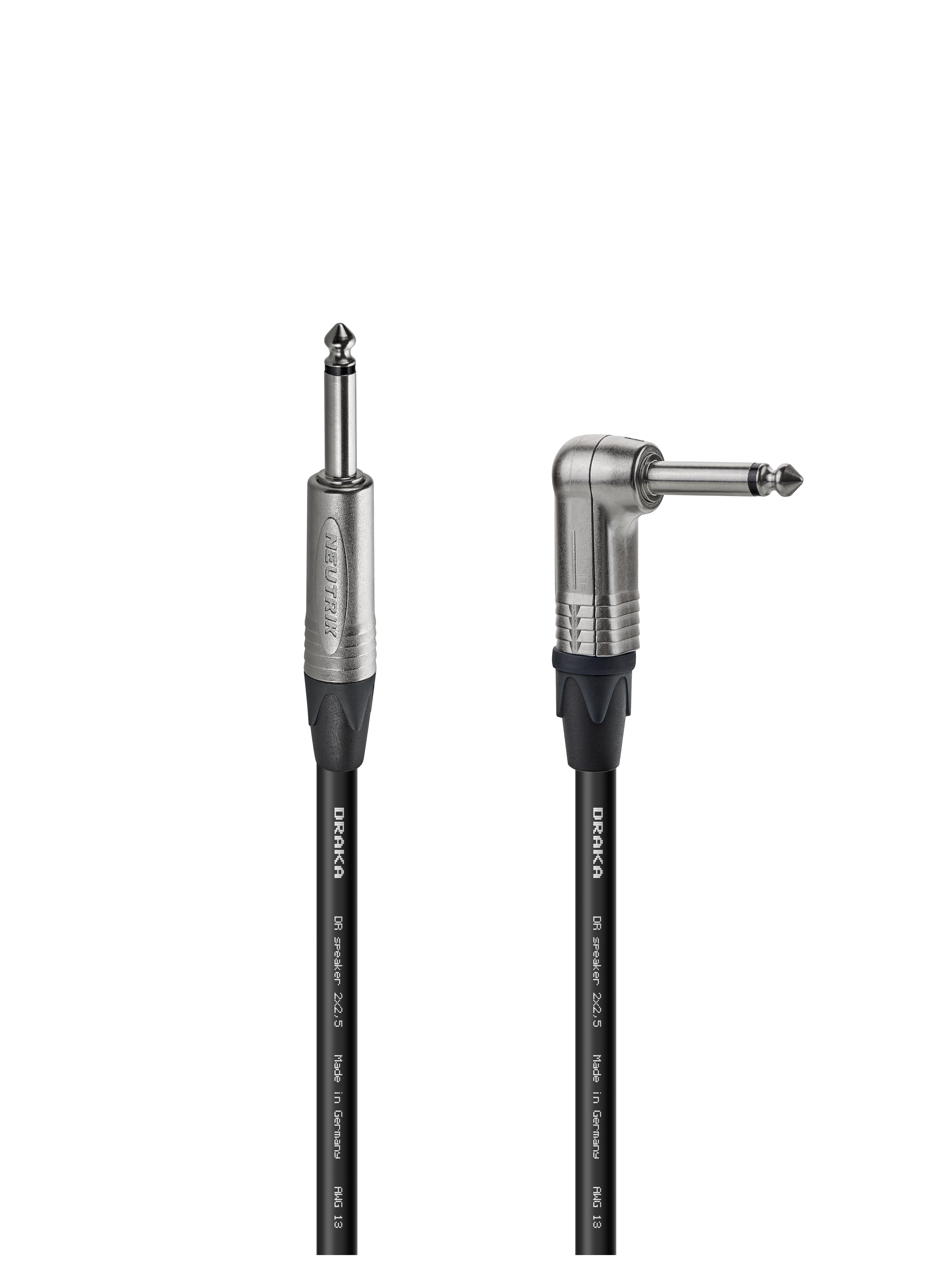 Акустический кабель, Jack 6.3 mono штекер > Jack 6.3 mono штекер угловой. Комплектующие: разъемы Neutrik NP2X; Neutrik NP2RX; Кабель Draka DR speaker 2x2,5; цвет: черный.