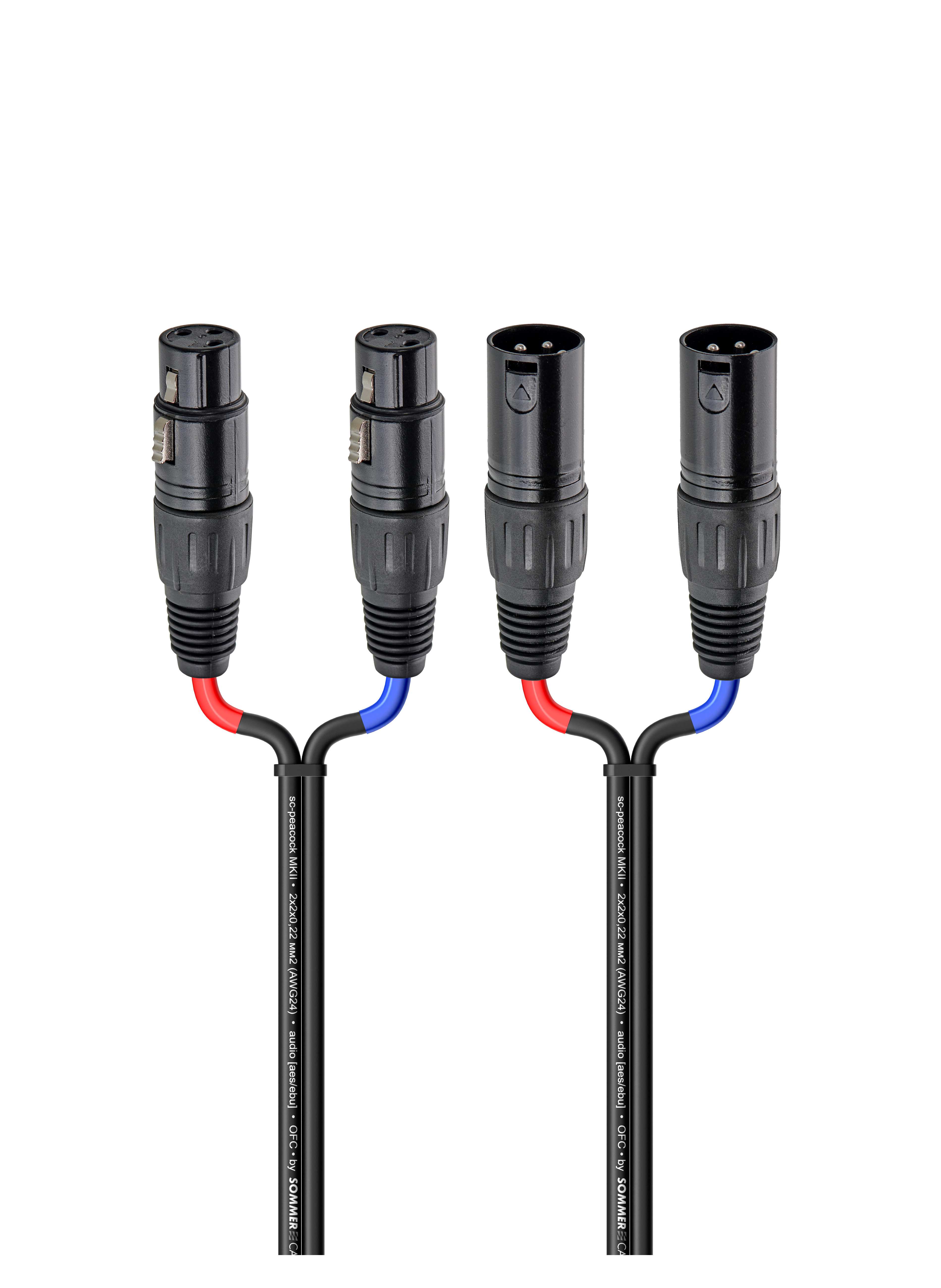 Балансный параллельный аудио кабель, Econom, 2х XLR3 гнездо > 2х XLR3 штекер. Комплектующие: разъемы MrCable MRC MRX3F, MRC MRX3M; Кабель симметричный, сдвоенный Sommer Cable SC-PEACOCK MKII BLK; цвет: черный.