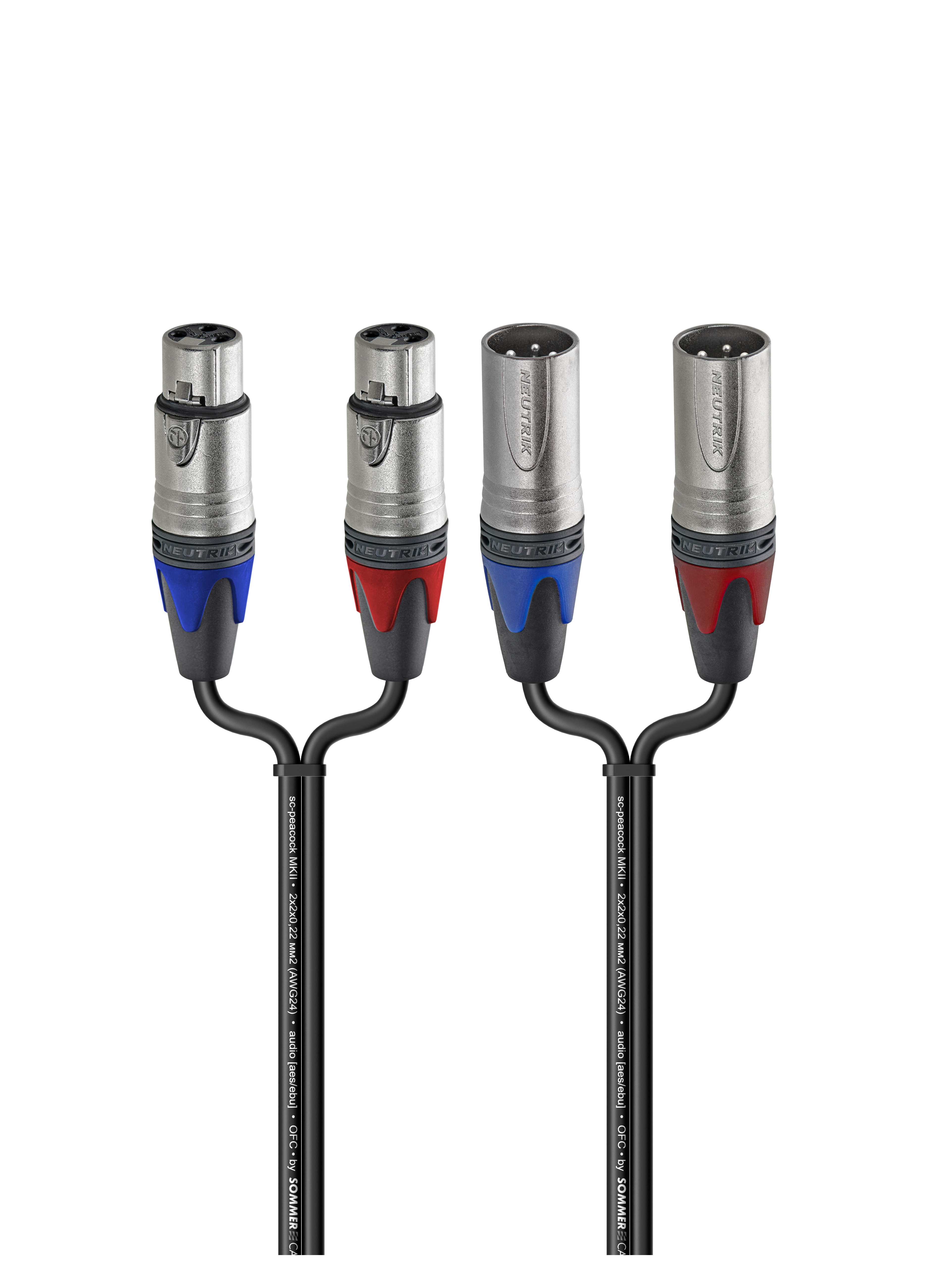 Балансный параллельный аудио кабель, Standart, 2х XLR3 гнездо > 2х XLR3 штекер. Комплектующие: разъемы Neutrik NC3FXX; NC3MXX; Кабель симметричный, сдвоенный Sommer Cable SC-PEACOCK MKII BLK; цвет: черный.