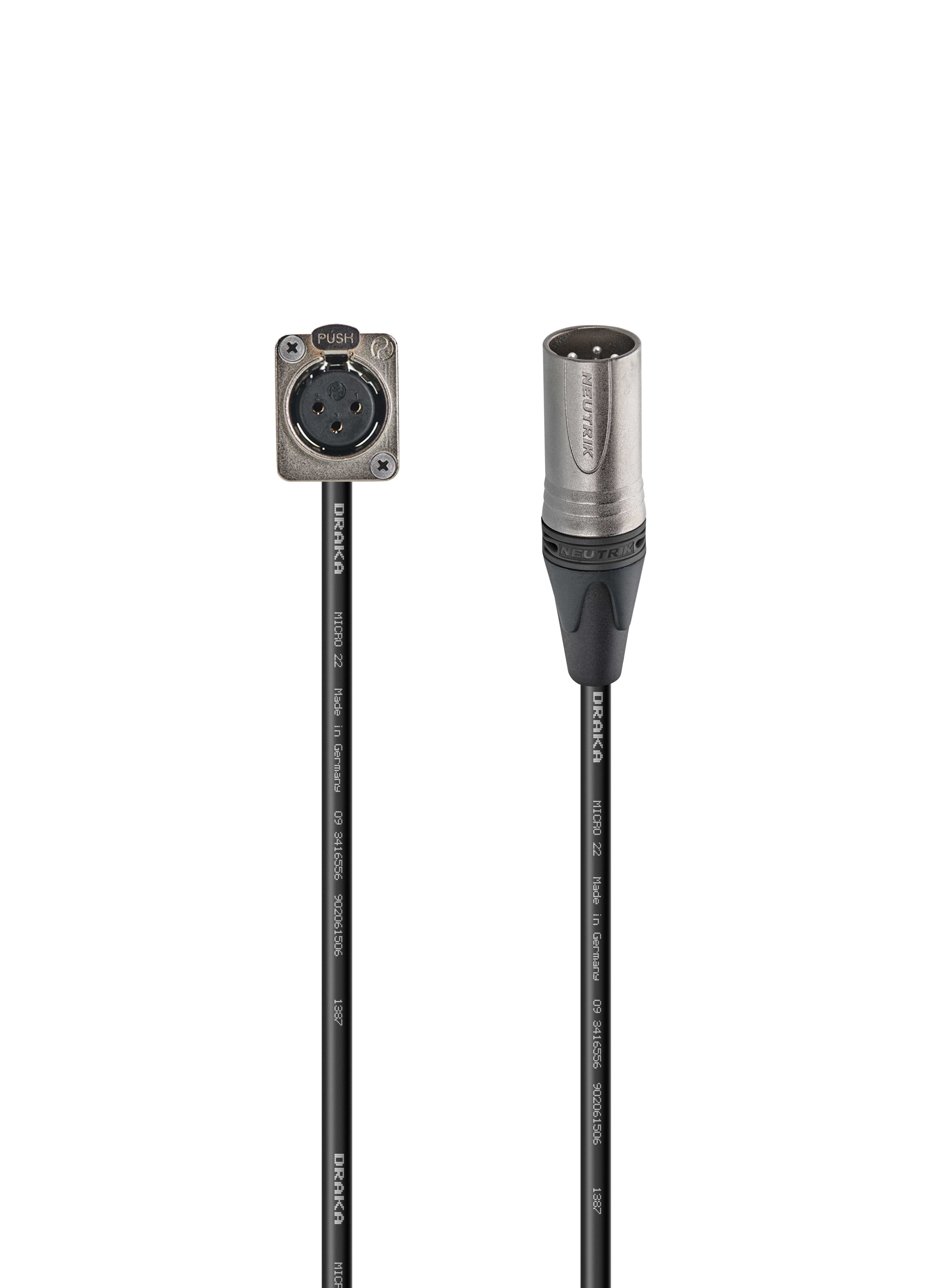 Балансный переходной аудио кабель, Standart, панельный монтаж, XLR3 гнездо панельный > XLR3 штекер кабельный. Комплектующие: разъемы Neutrik NC3FD-L-1; NC3MXX; Кабель Draka DR MICRO 22; цвет: черный.