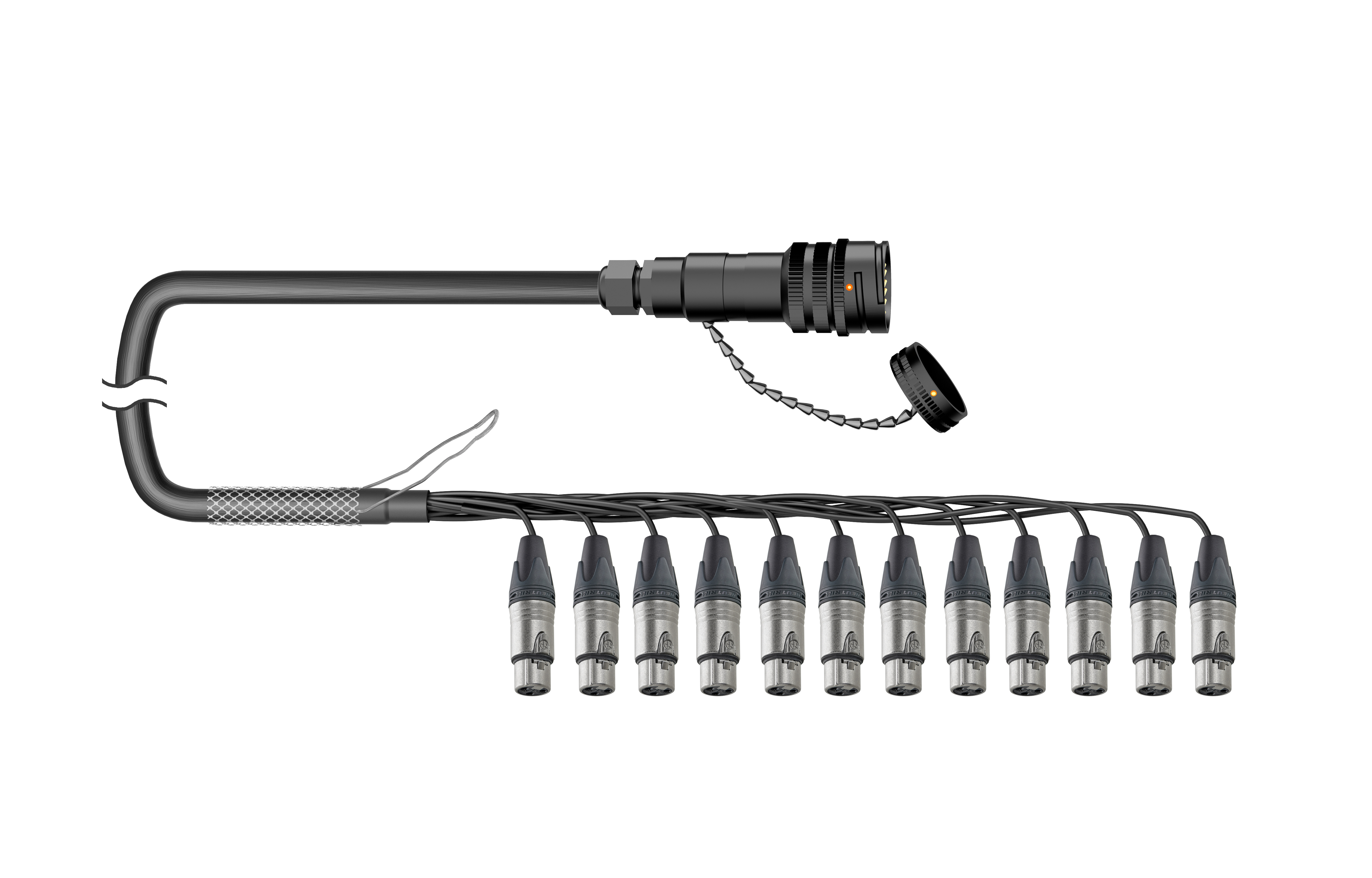 12-кан. (12-OUT) аудиомультикорный кабель, Standart, Мультипин штекер > коса (12х XLR3 гнездо), защитная корзина. Комплектующие: разъемы Круглый (Мультипин); Neutrik NC3FXX; Мультикор аналоговый Canare MR202-12AT; цвет: черный.