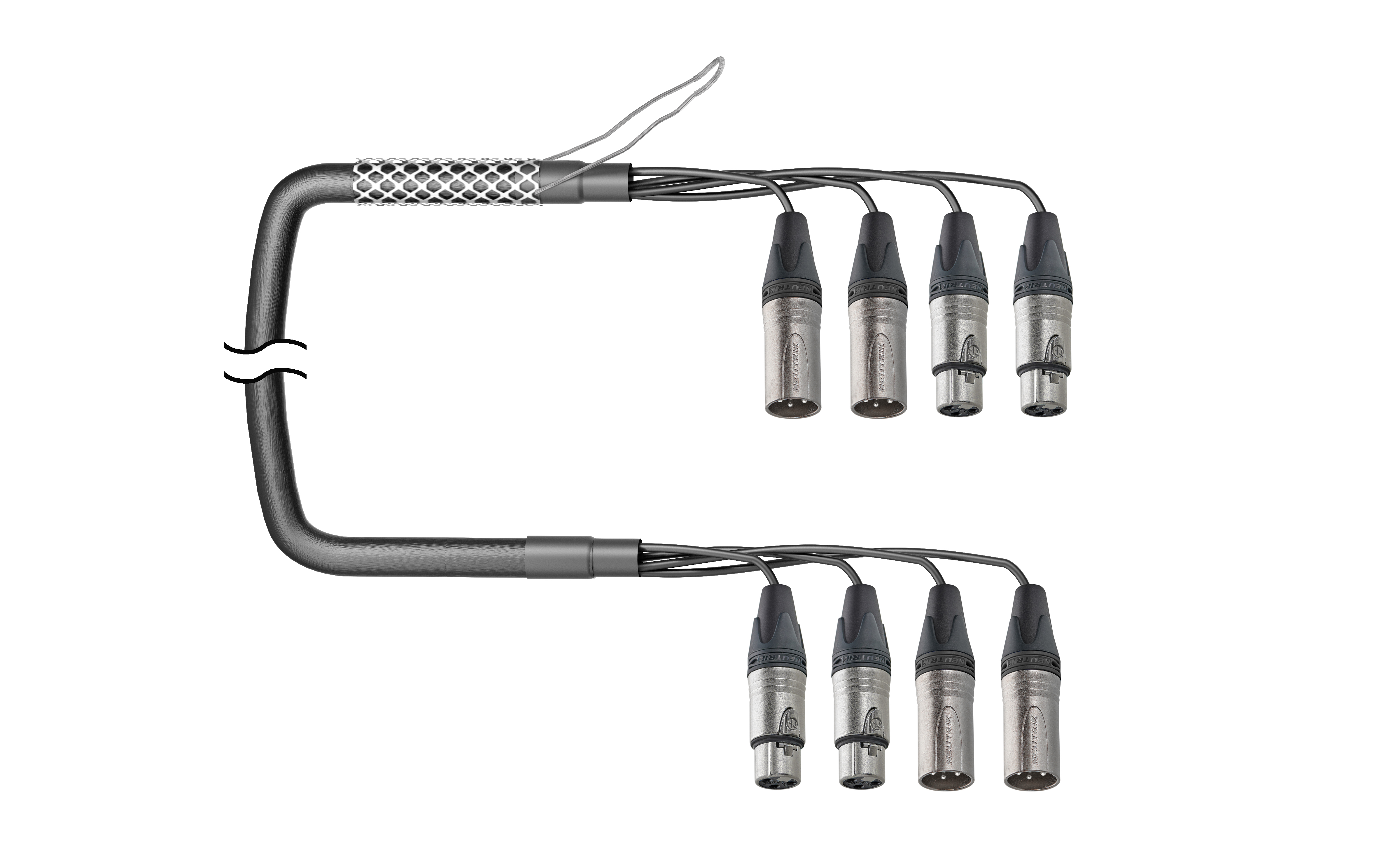 4-кан. (2-IN/2-OUT) аудиомультикорный кабель, Standart, коса (2х XLR3 штекер/2х XLR3 гнедо), защитная корзина > коса (2х XLR3 гнездо/2х XLR3 штекер). Комплектующие: разъемы Neutrik NC3MXX; NC3FXX; Мультикор аналоговый Canare MR202-4AT; цвет: черный.