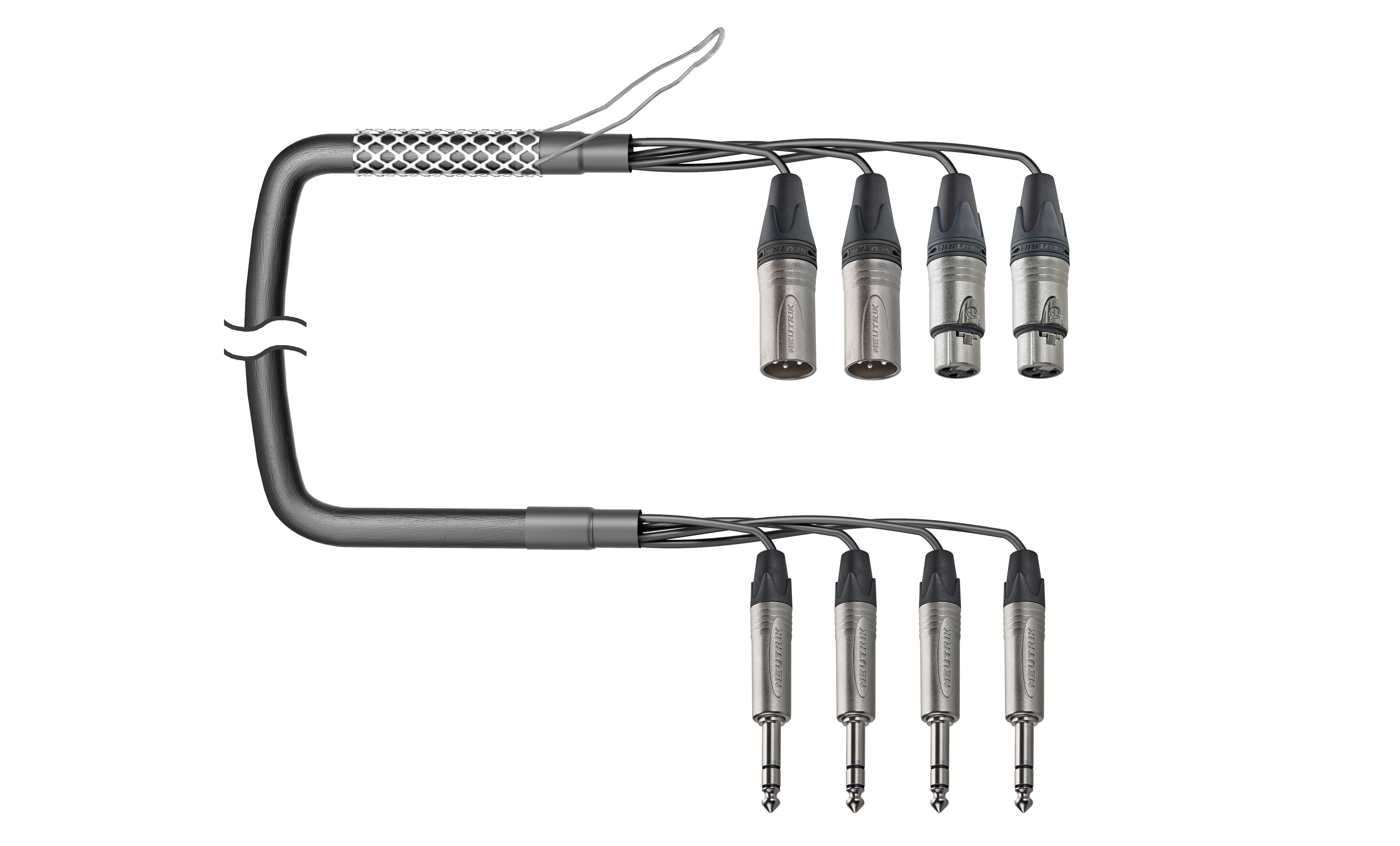 4-кан. (2-IN/2-OUT) аудиомультикорный кабель, Standart, коса (2х XLR3 штекер/2х XLR гнездо), защитная корзина > коса (4х Jack 6.3 мм стерео штекер). Комплектующие: разъемы Neutrik NC3MXX; NC3FXX; NP3X; Мультикор аналоговый Canare MR202-4AT; цвет: черный.